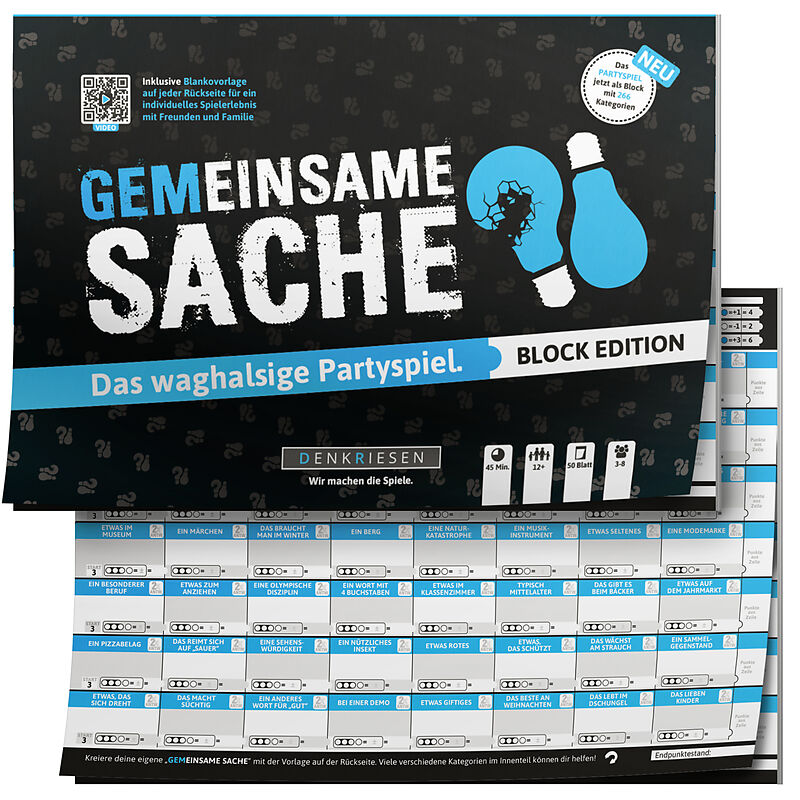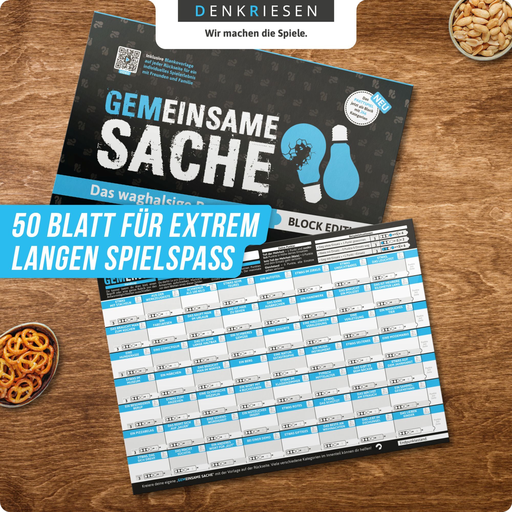 GEMEINSAME SACHE Block Edition Dieser ultimative Spielblock ist die offizielle neue Edition des beliebten, waghalsigen Partyspiels! Hier geht es darum, die Gemeinsame Sache zu finden. Jeder Spieler schreibt zu einer Kategorie einen passenden Begriff auf. Der m...