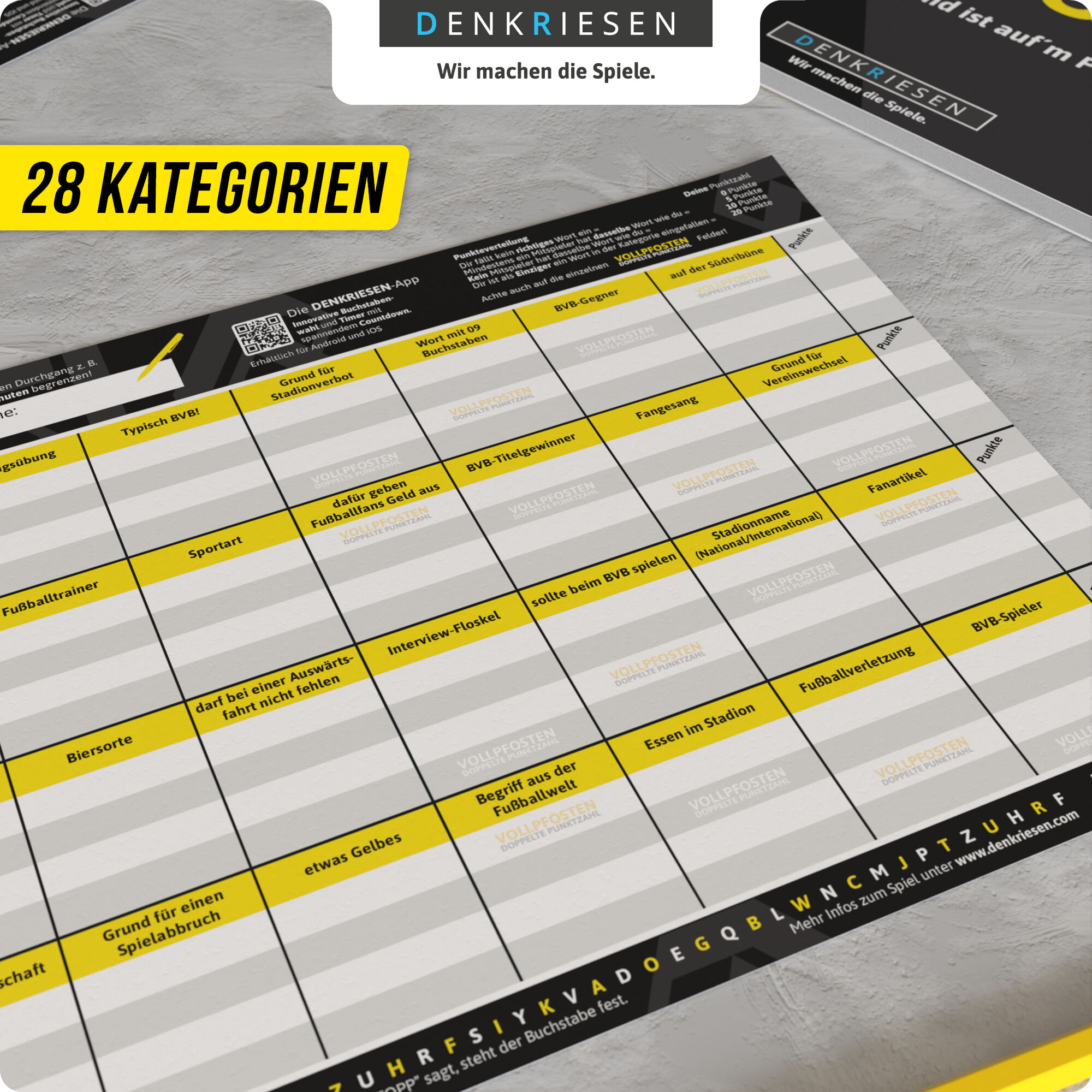 Die offizielle schwarz-gelbe Edition des Kultspiels STADT LAND VOLLPFOSTEN rund ums Thema Fußball und Fanliebe. Dieser Spielblock mit 28 kreativen und lustigen Kategorien bringt jeden BVB-Fan ins Schwitzen. Spaß garantiert!