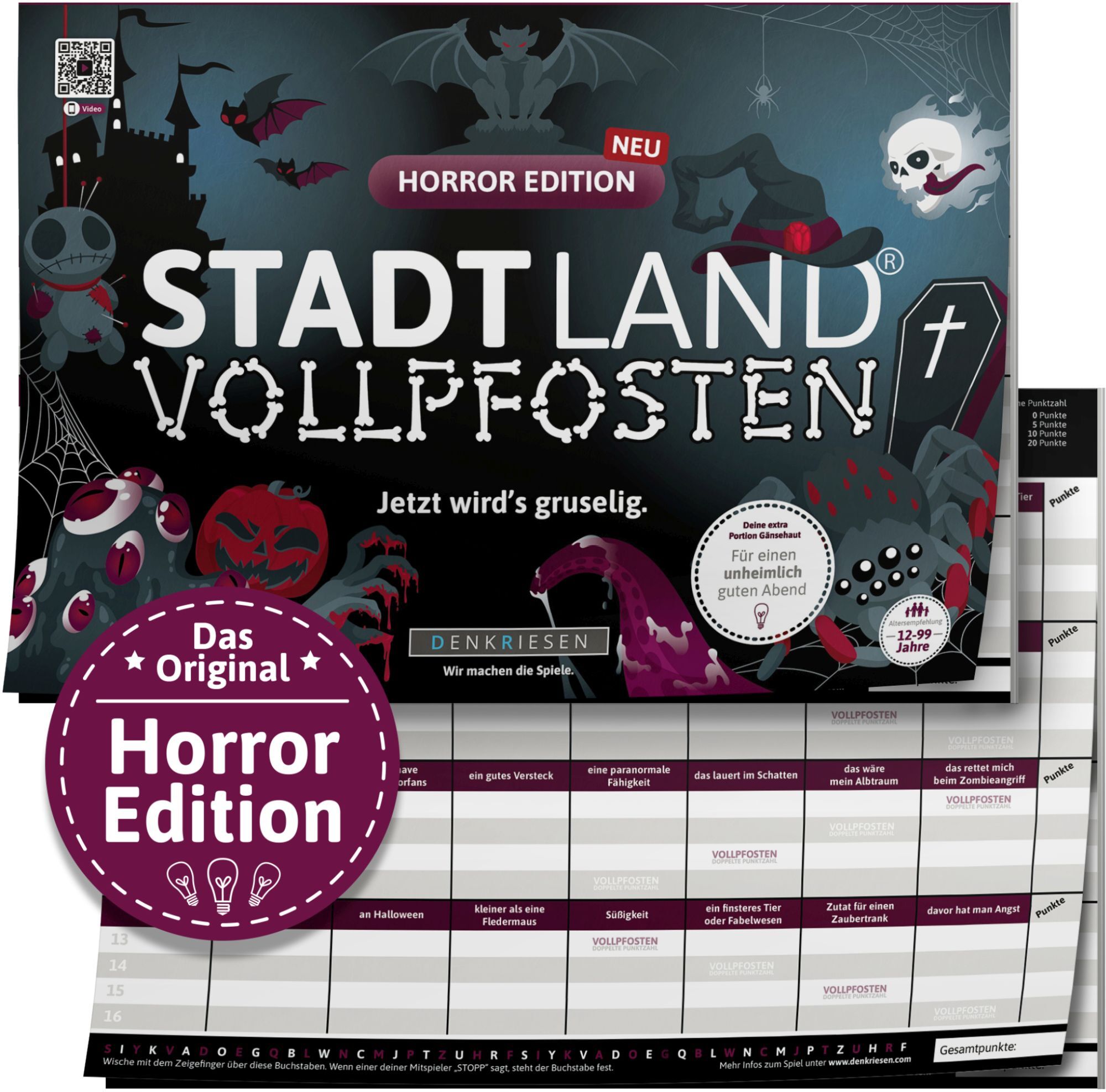 STADT LAND VOLLPFOSTEN® - HORROR EDITION - Jetzt wird's gruselig. - A4 Die unheimliche Edition des Kultspiels STADT LAND VOLLPFOSTEN rund ums Thema Grusel und Horror. Der ultimative Spielblock mit 26 kreativen und lustigen Kategorien für einen schaurig-schönen...