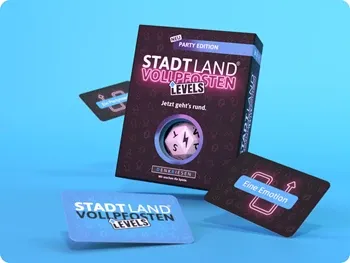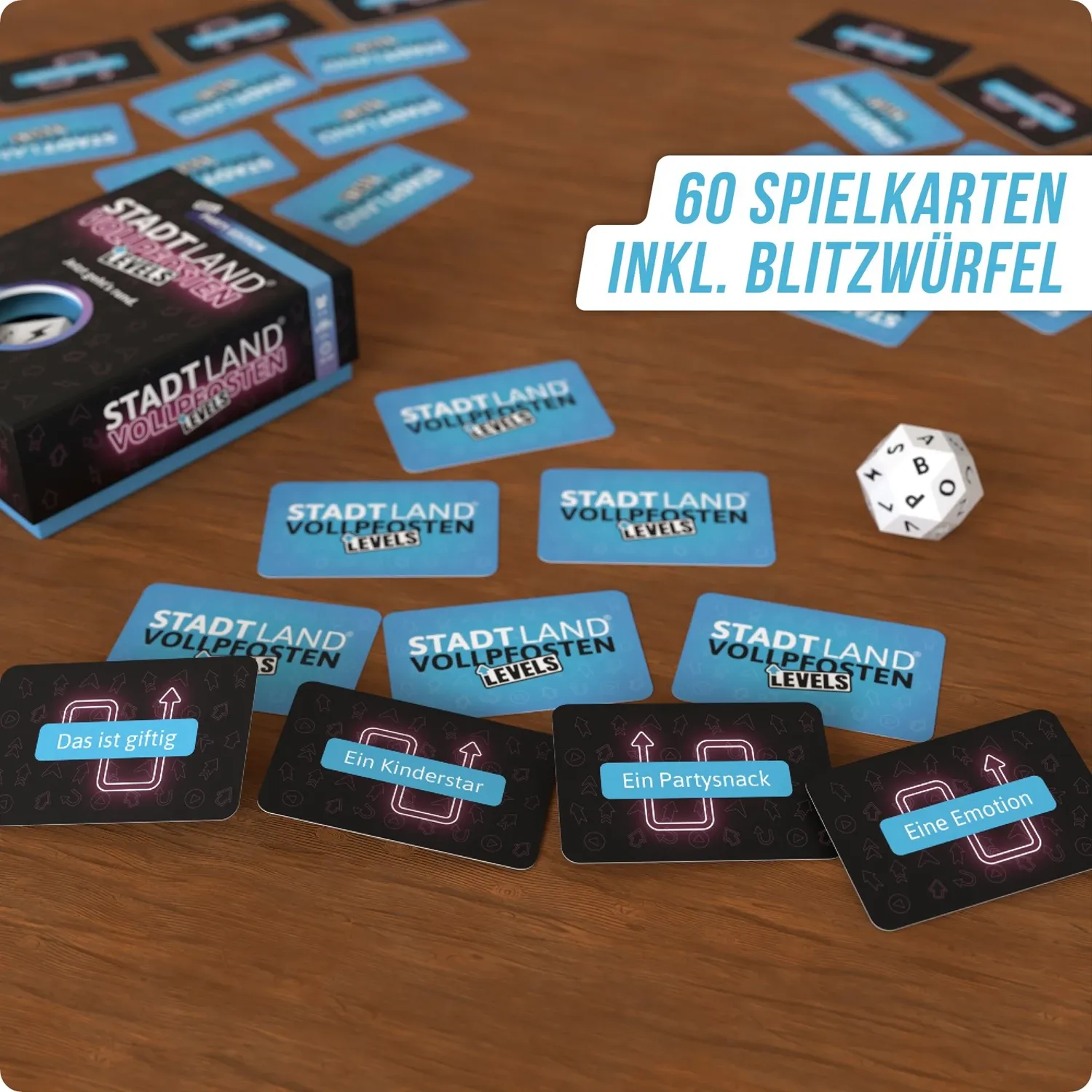 DENKRIESEN - STADT LAND VOLLPFOSTEN® - Levels - PARTY EDITION - ''Jetzt geht's rund.'' Erlebe mit ''STADT LAND VOLLPFOSTEN - Levels'', der neuesten Variante des Klassikers 'Stadt Land VOLLPFOSTEN', actionreiche Spielrunden für 2-6 Spieler ab 12 Jahren, bei den...