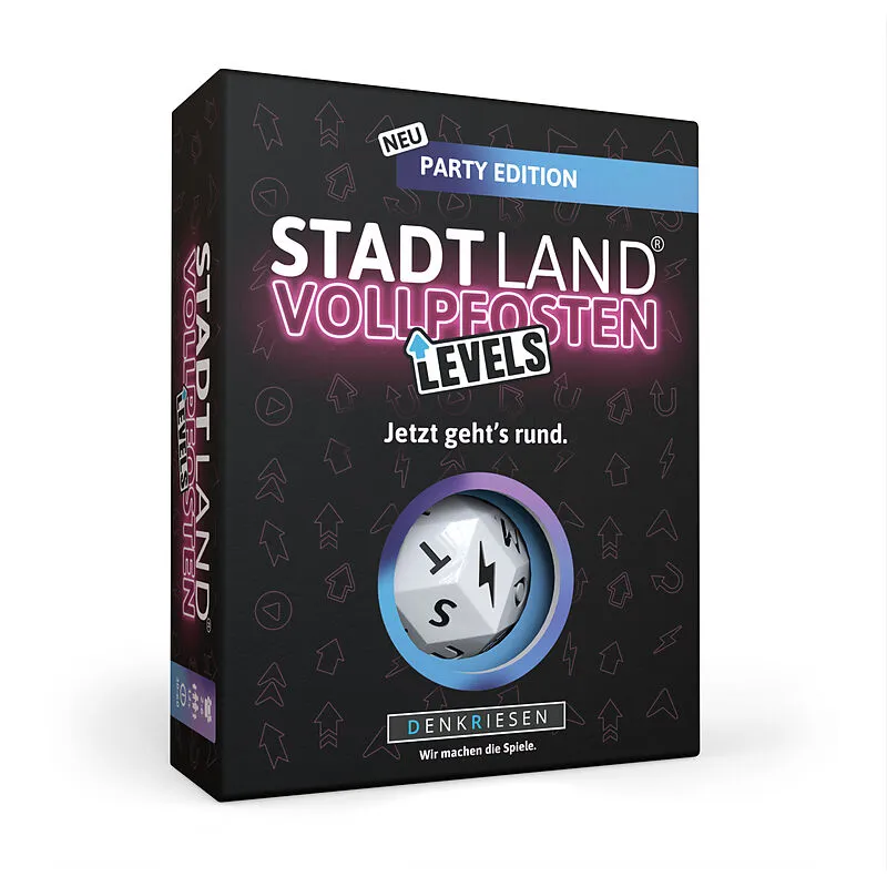 DENKRIESEN - STADT LAND VOLLPFOSTEN® - Levels - PARTY EDITION - ''Jetzt geht's rund.'' Erlebe mit ''STADT LAND VOLLPFOSTEN - Levels'', der neuesten Variante des Klassikers 'Stadt Land VOLLPFOSTEN', actionreiche Spielrunden für 2-6 Spieler ab 12 Jahren, bei den...