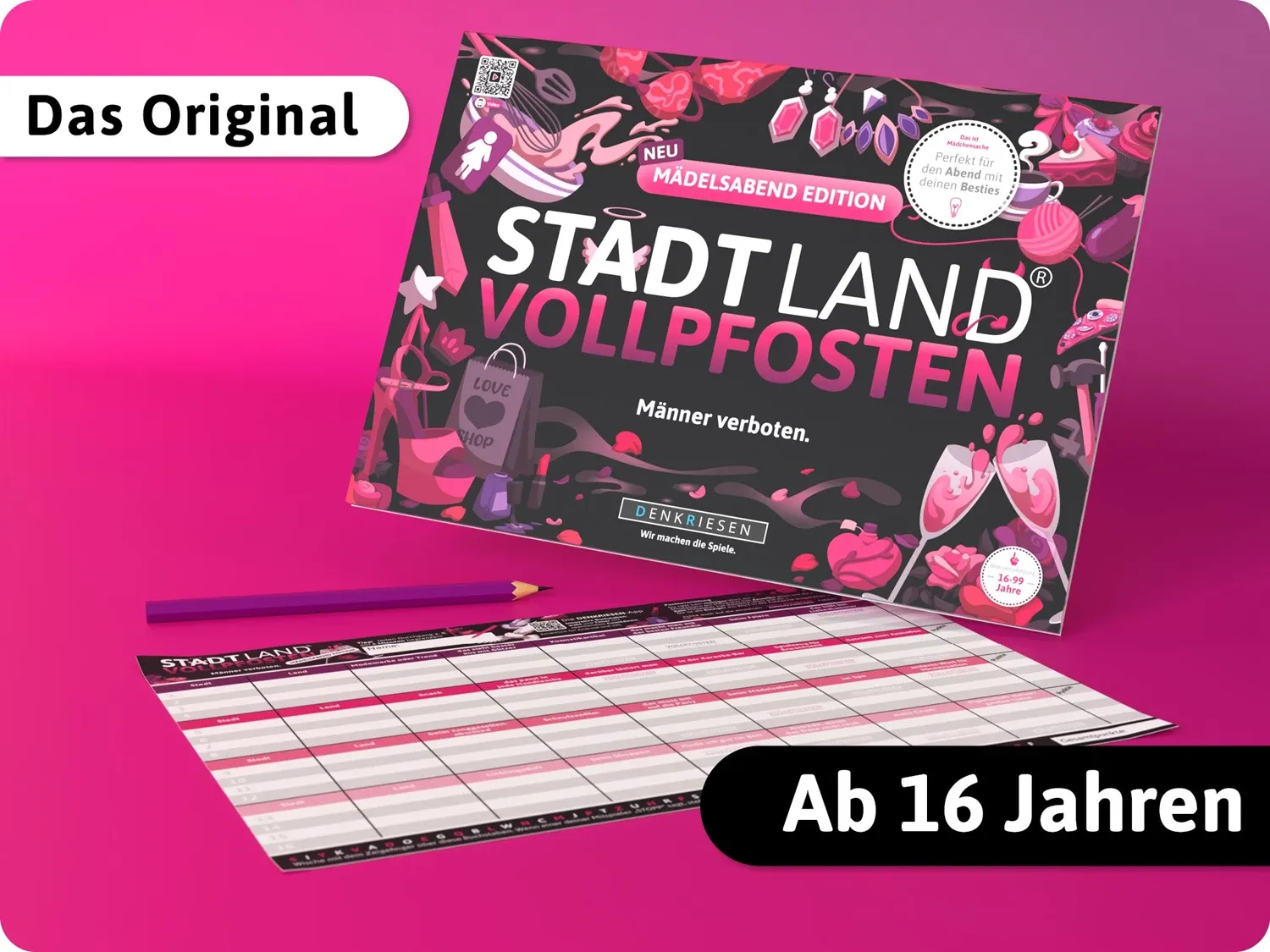 Die pinke Edition des Kultspiels STADT LAND VOLLPFOSTEN rund um's Thema Mädels und Freundinnen. Dieser Spielblock mit 26 kreativen und lustigen Kategorien passt perfekt zu einem Abend mit deiner Clique. Spaß garantiert!