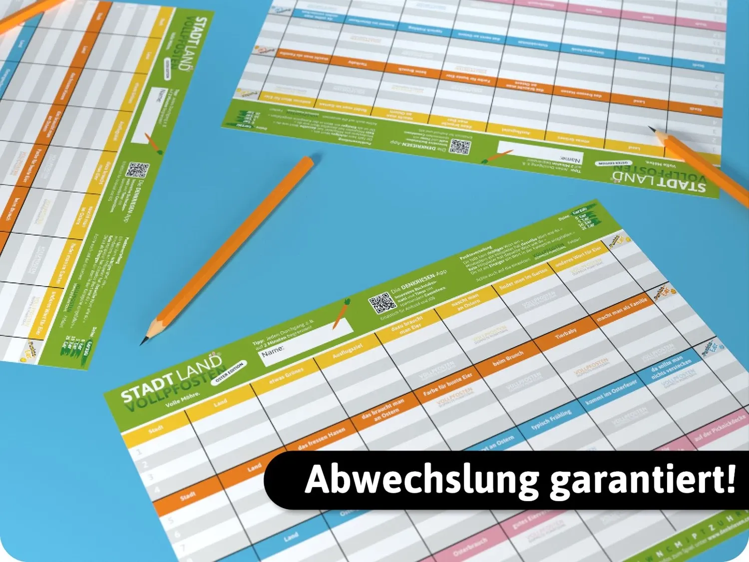 Die frühlingsfrische Edition des Kultspiels STADT LAND VOLLPFOSTEN rund ums Thema Hasen und Eier. Der ultimative Spielblock mit 26 kreativen und lustigen Kategorien für ein unvergessliches Osterfest mit Familie und Freunden.