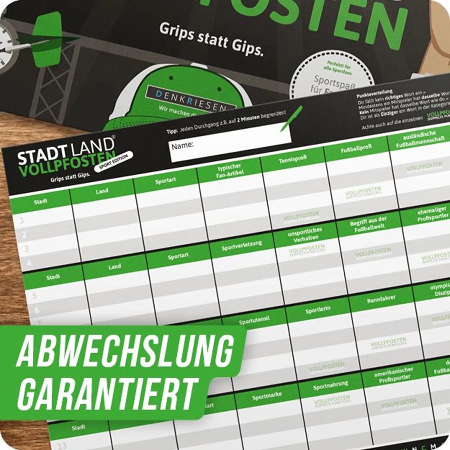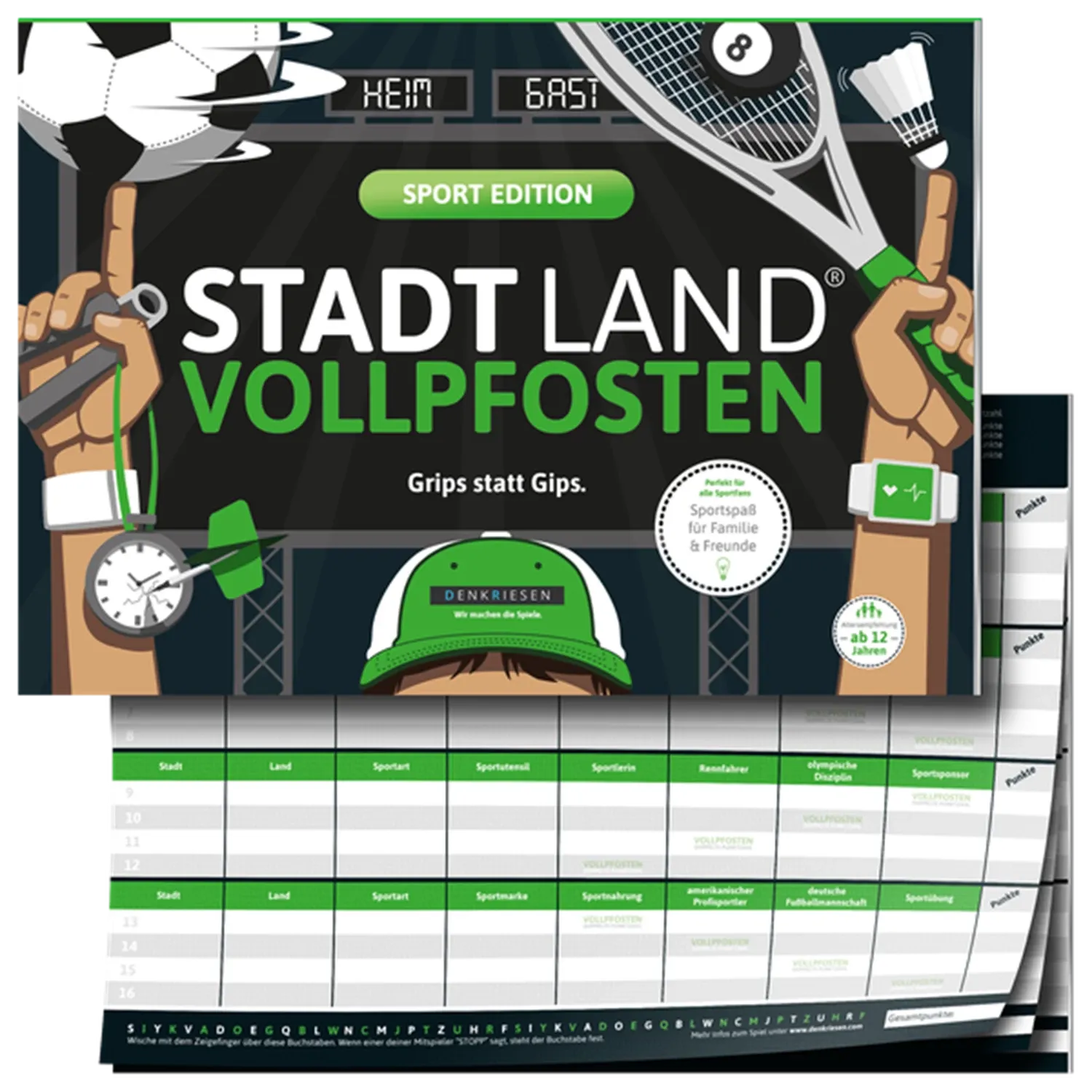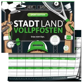 Die offizielle Sport Edition der kreativen Stadt-Land-Fluss Variante Stadt Land Vollpfosten. Der Spielblock im DIN A4-Format ist besonders praktisch und handlich im Vergleich zu den großen Blöcken - ein ideales Spiel für einen Mannschaftsabend oder ein tolles ...