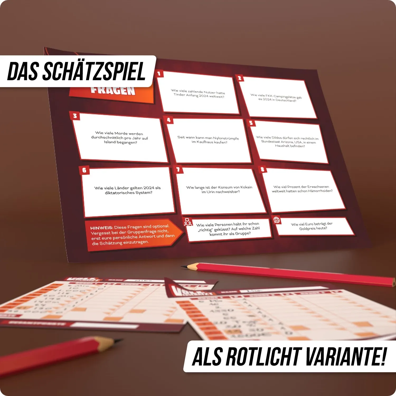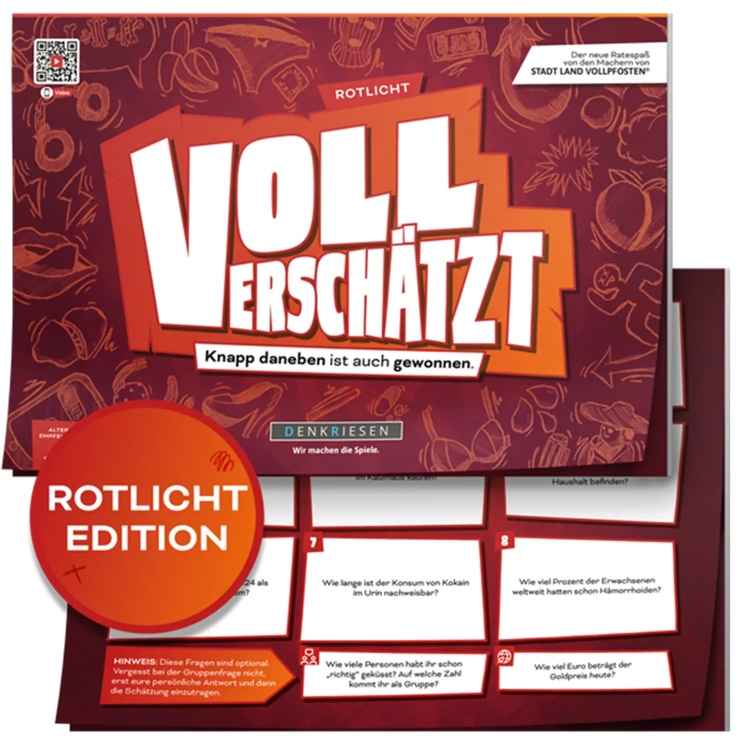 VOLL VERSCHÄTZT! Rotlicht Edition - Knapp daneben ist auch gewonnen Schnapp dir Freunde und Familie und taucht gemeinsam in die Welt von VOLL VERSCHÄTZT ein - dem verrücktesten Schätzspiel aller Zeiten. Hier erwarten dich 350 pikante Fragen aus allen Themenber...