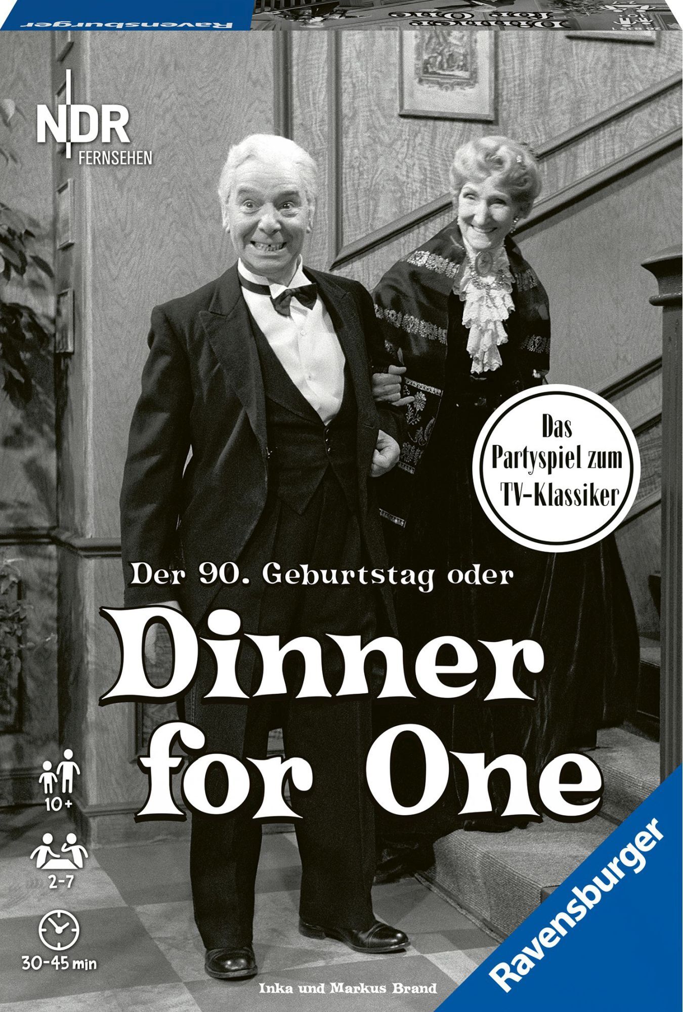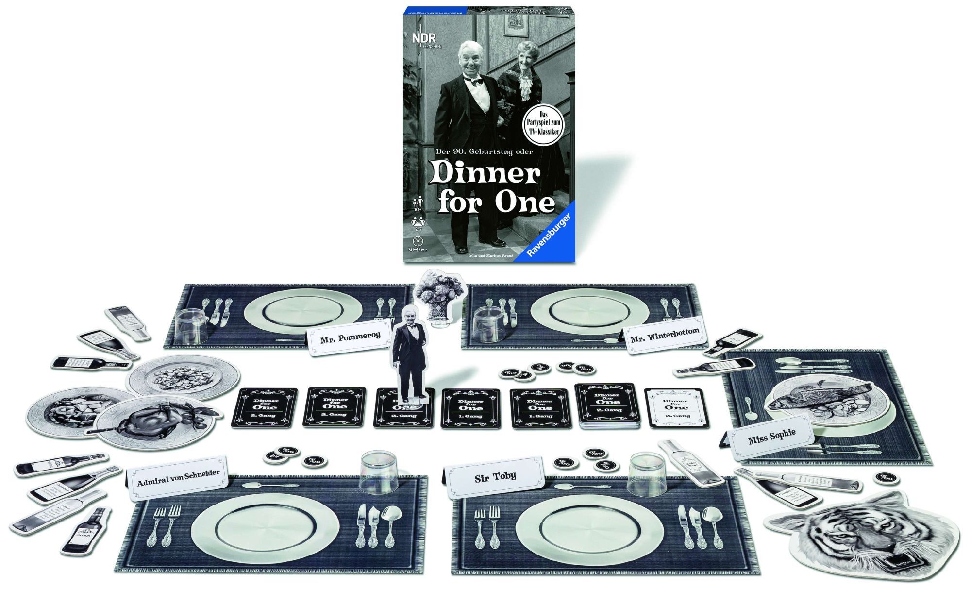 Ravensburger 26835 Der 90. Geburtstag oder Dinner for One Dinner for One - Das Partyspiel zum TV-Klassiker: Anlässlich ihres 90. Geburtstages lädt Miss Sophie zu ihrem alljährlichen Geburtstagsdinner. Die Spieler schlüpfen abwechselnd in die Rolle des Butlers ...