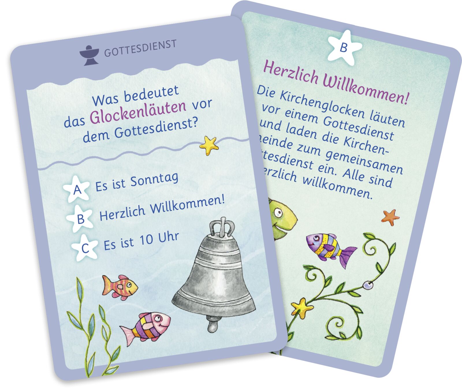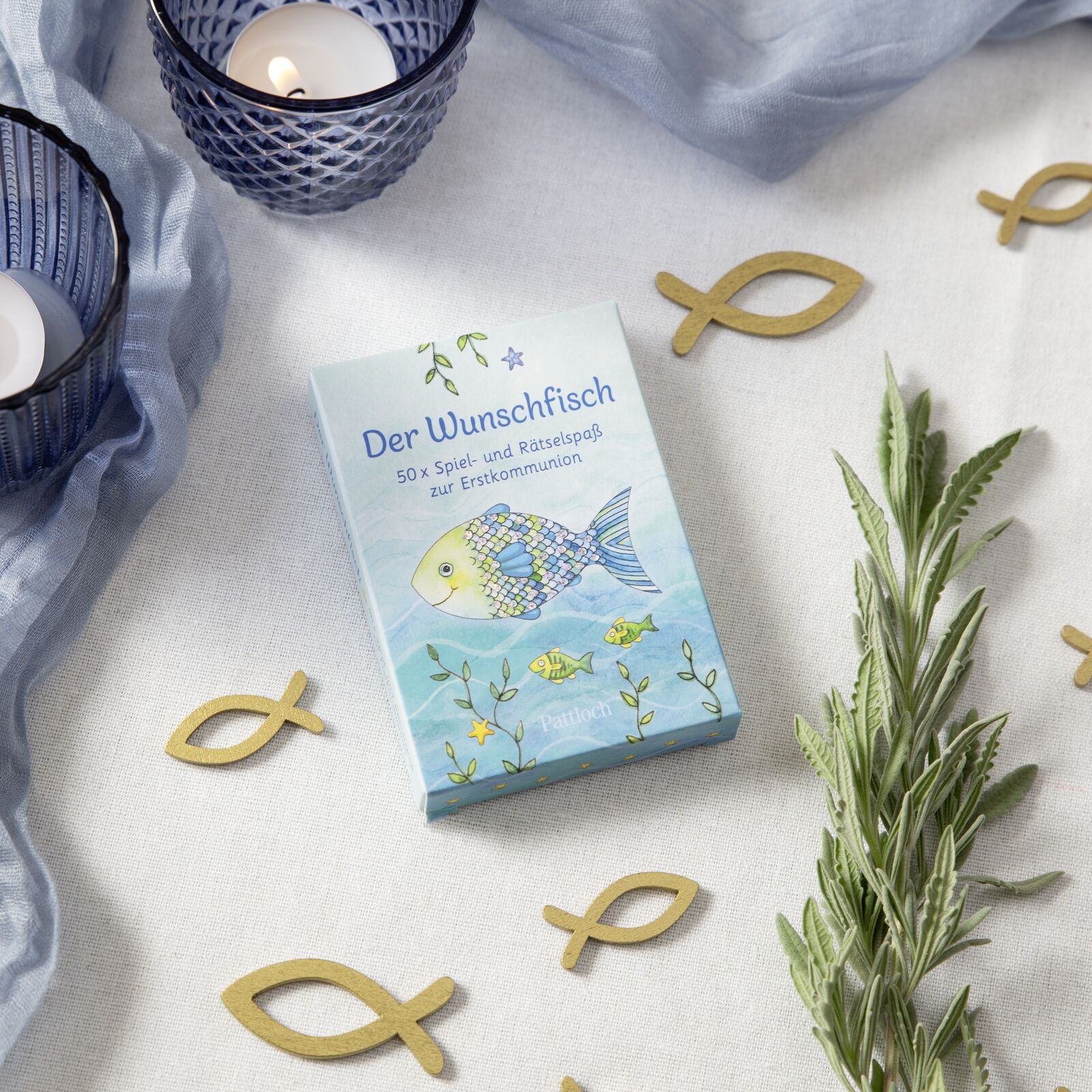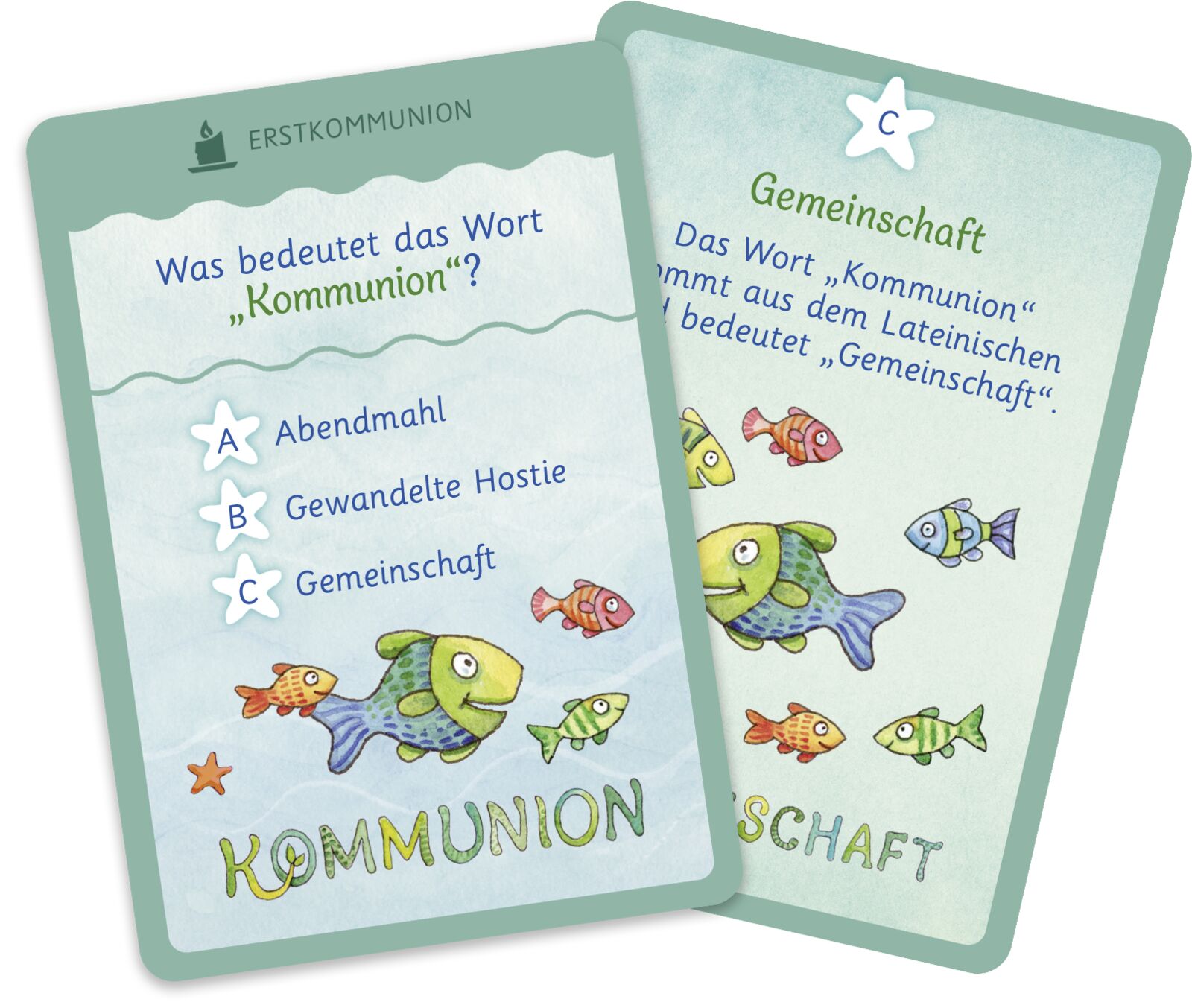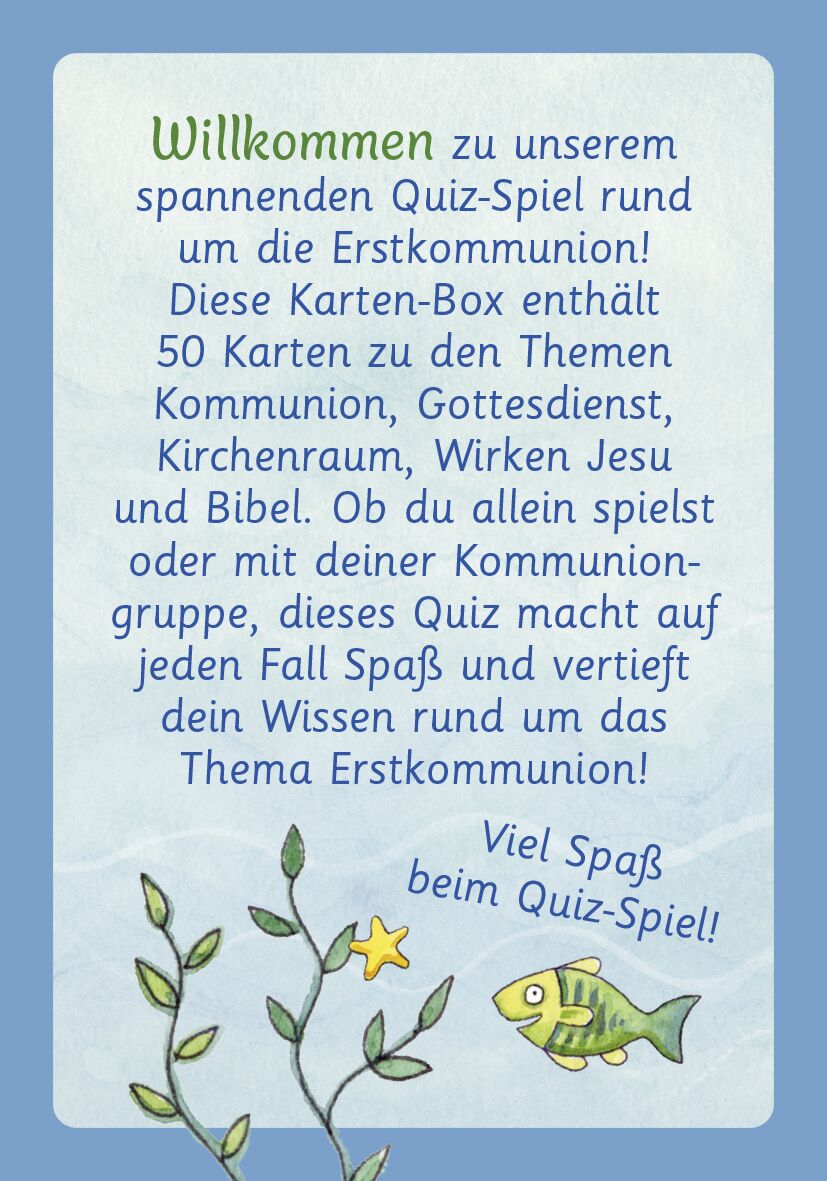 Tolles Quiz-Spiel rund um die Erstkommunion - mit dem beliebten Wunschfisch 50 Quiz-Fragen zur Kommunion stellt das Kartenspiel mit dem zauberhaften Wunschfisch von Silvia Habermeier: Auf der Vorderseite der Karten stehen jeweils die Frage und drei Antwort-Mö...