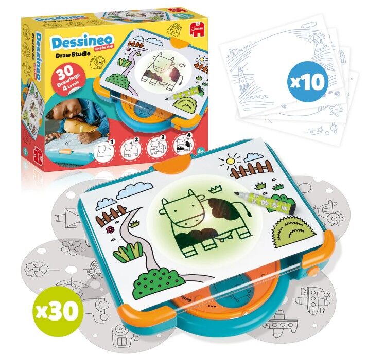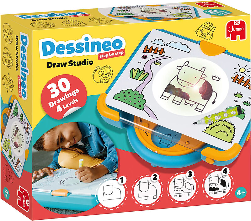Erstelle die schönsten Zeichnungen mit Dessineo von Jumbo! Dessineo ist speziell für Kinder ab 4 Jahren entwickelt. Kinder lernen auf einfache und spielerische Weise Schritt für Schritt zu zeichnen. Wie funktioniert es? Wähle eine der transparenten Zeichenvorl...