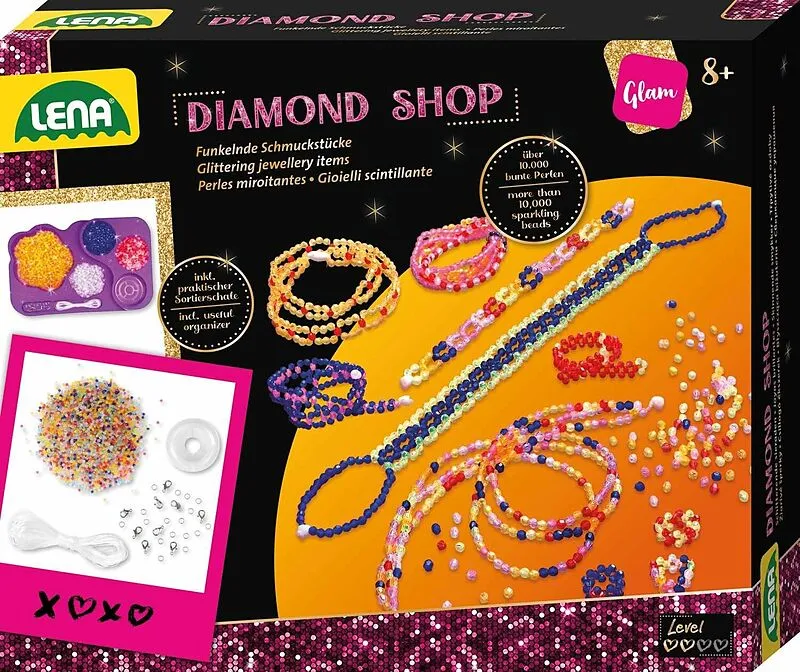 Diamond Shop, groß LENA® Diamond Shop, groß, schillernde Armbänder, Ketten und Ringe zum selbst Basteln. Enthält 10.000 schillernde Kunststoff-Perlen, elastischen Faden und eigene Bastelstation. Geeignet für Kinder ab 8 Jahren. Ausführlich bebilderte Anleitung...