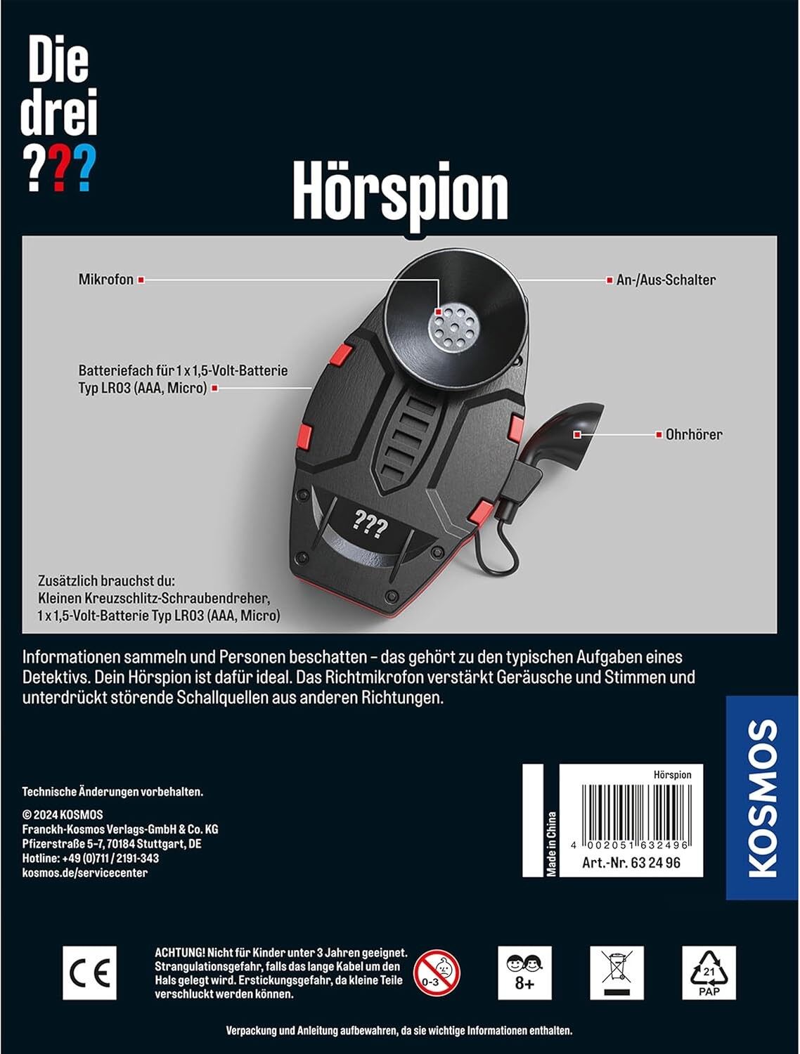 Ermöglicht geheime, verdeckte Ermittlungen für Nachwuchs-Detektive Der Hörspion enthält ein empfindliches Mikrophon, das Geräusche aus einer bestimmten Richtung aufnimmt und verstärkt. Wo findet die nächste Übergabe statt? Wird über den Tatort gesprochen? Mit ...