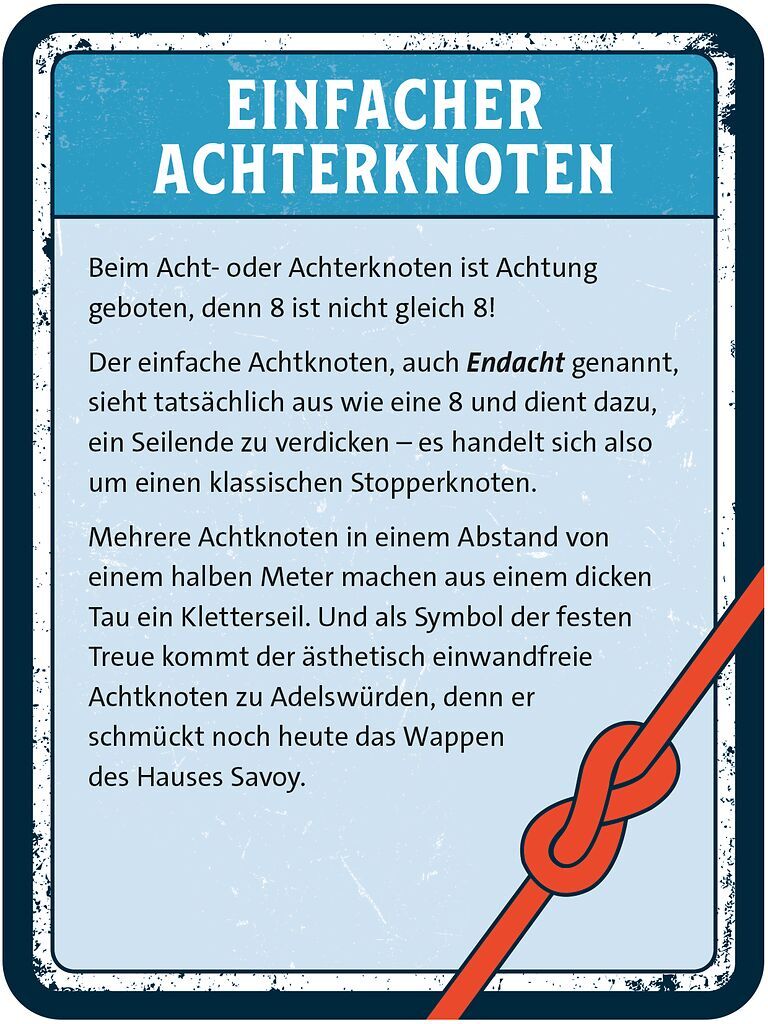 Knoten knüpfen für jede Situation! Diese Box enthält 50 Knoten-Klassiker für Freizeit, Sport und Alltag! Mit Schritt-für-Schritt Anleitungen und anschaulichen Illustrationen zur Veranschaulichung lernt man die unterschiedlichsten Knoten kennen und knüpfen. Von...