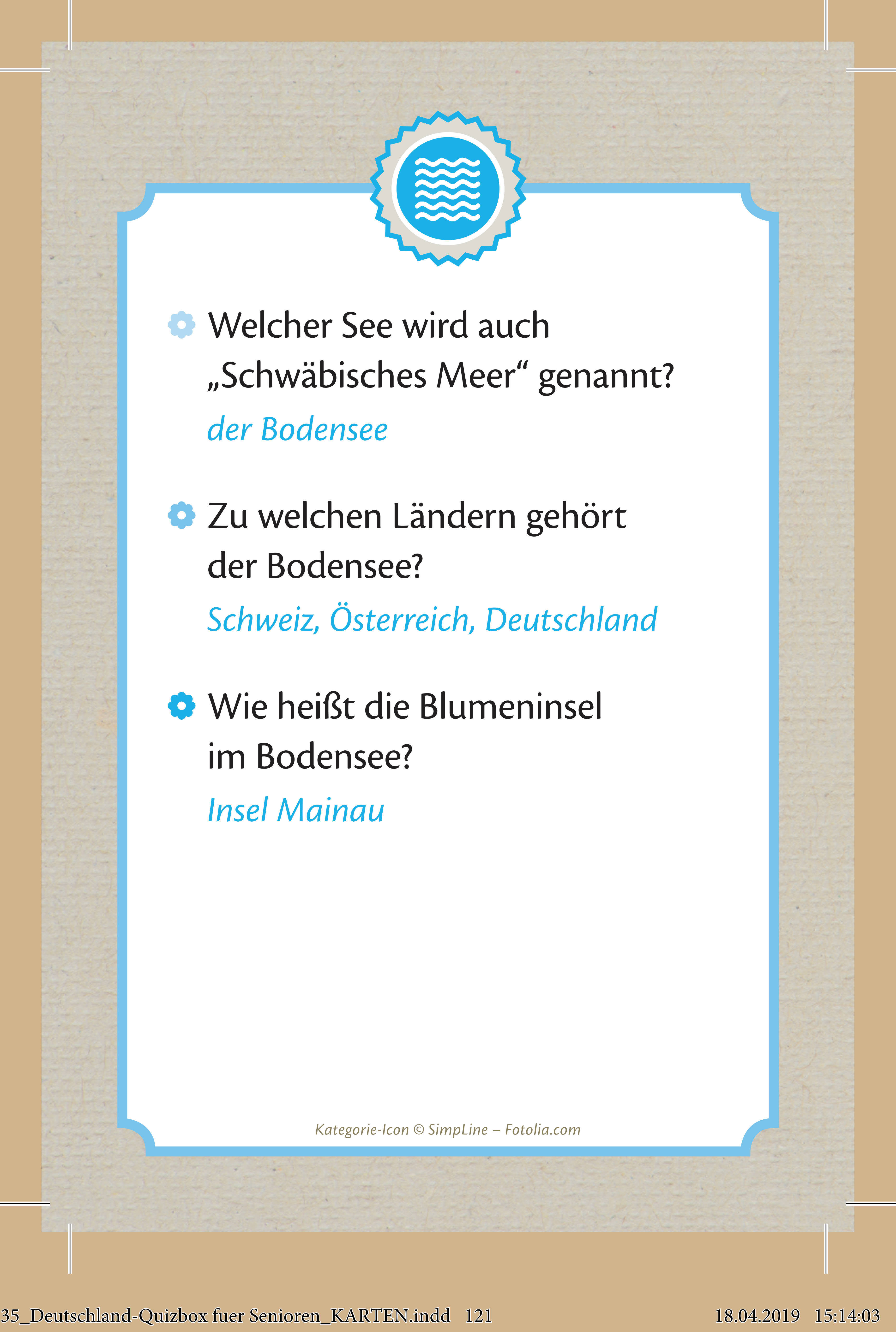 Quizspiel zur Aktivierung und Beschäftigung für Senioren und Seniorinnen, für Fachkräfte in Altenpflege und Seniorenarbeit sowie für pflegende Angehörige zu Hause +++ Welcher See wird auch "Schwäbisches Meer" genannt? Richtig: der Bodensee. In welche...
