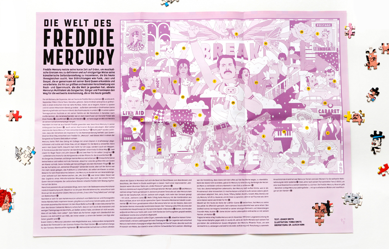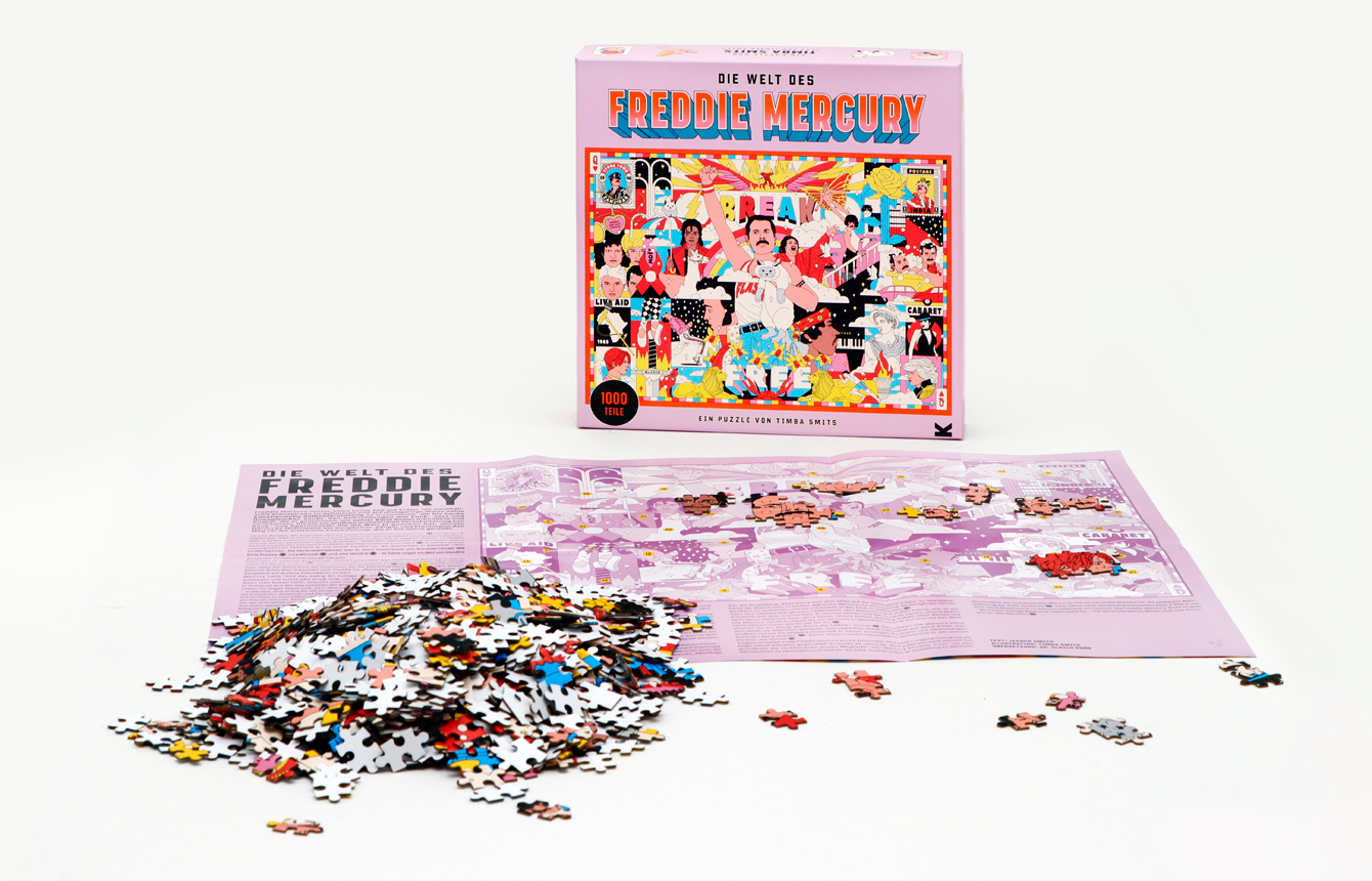 Setzen Sie die Welt von Freddie Mercury in diesem Puzzle zusammen, das die Geschichte seines Lebens undseiner Songs in gezeichneten Mini-Szenen erzählt. Von Freddies Kindheit in Sansibar und England über seinen kometenhaften Aufstieg zum Rockstar mit Queen bis...