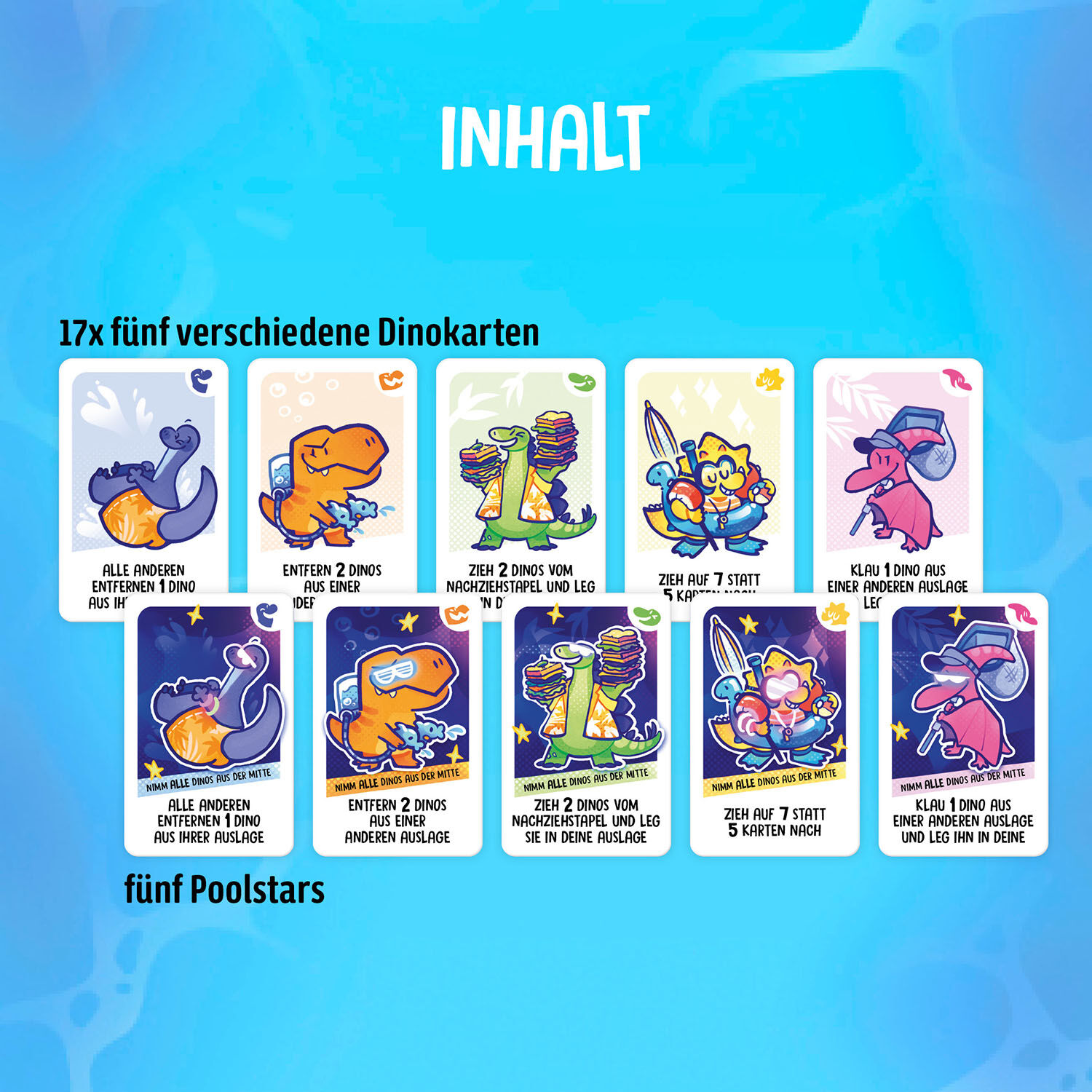 Witziges und schnelles Kartenspiel.Die süßen Dinos auf den Karten sorgen für ordentlich Wirbel.Für 2-6 Spielerinnen und Spieler ab 8 Jahren.Die Dinos sind los - und feiern eine Pool-Party! Wer es schafft, zuerst drei Sechser-Gruppen aus gleichfarbigen Dinos zu...