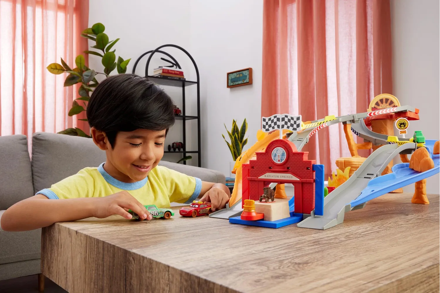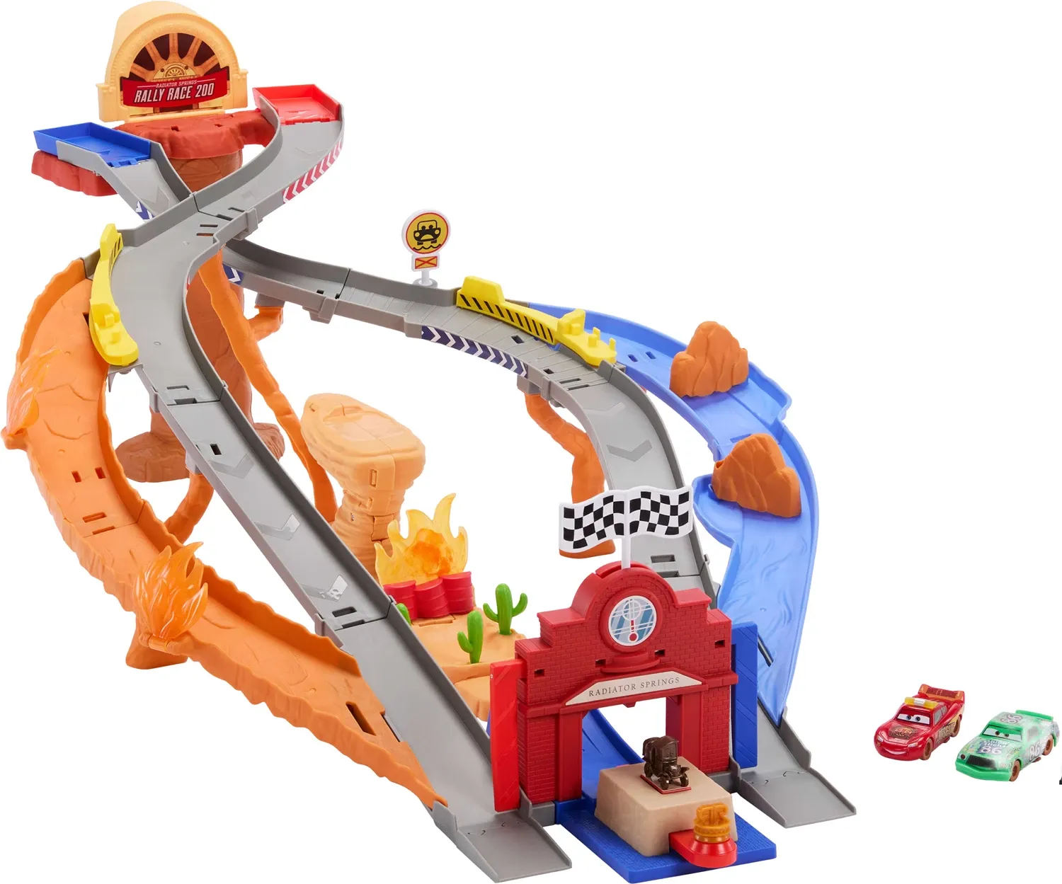 Dieses grosse Set bietet zwei Spielmöglichkeiten. Rennen und Rettungsmodus. Im Rettungsmodus lenken die Boxencrew-Mitglieder Lightning McQueen ab, sodass er durch Flammen oder über Steine rast, während Chick Hicks zuschaut.