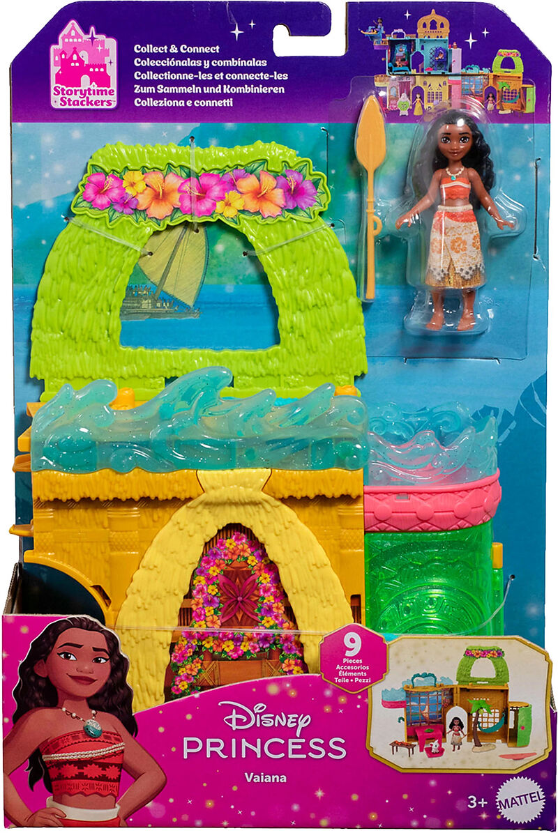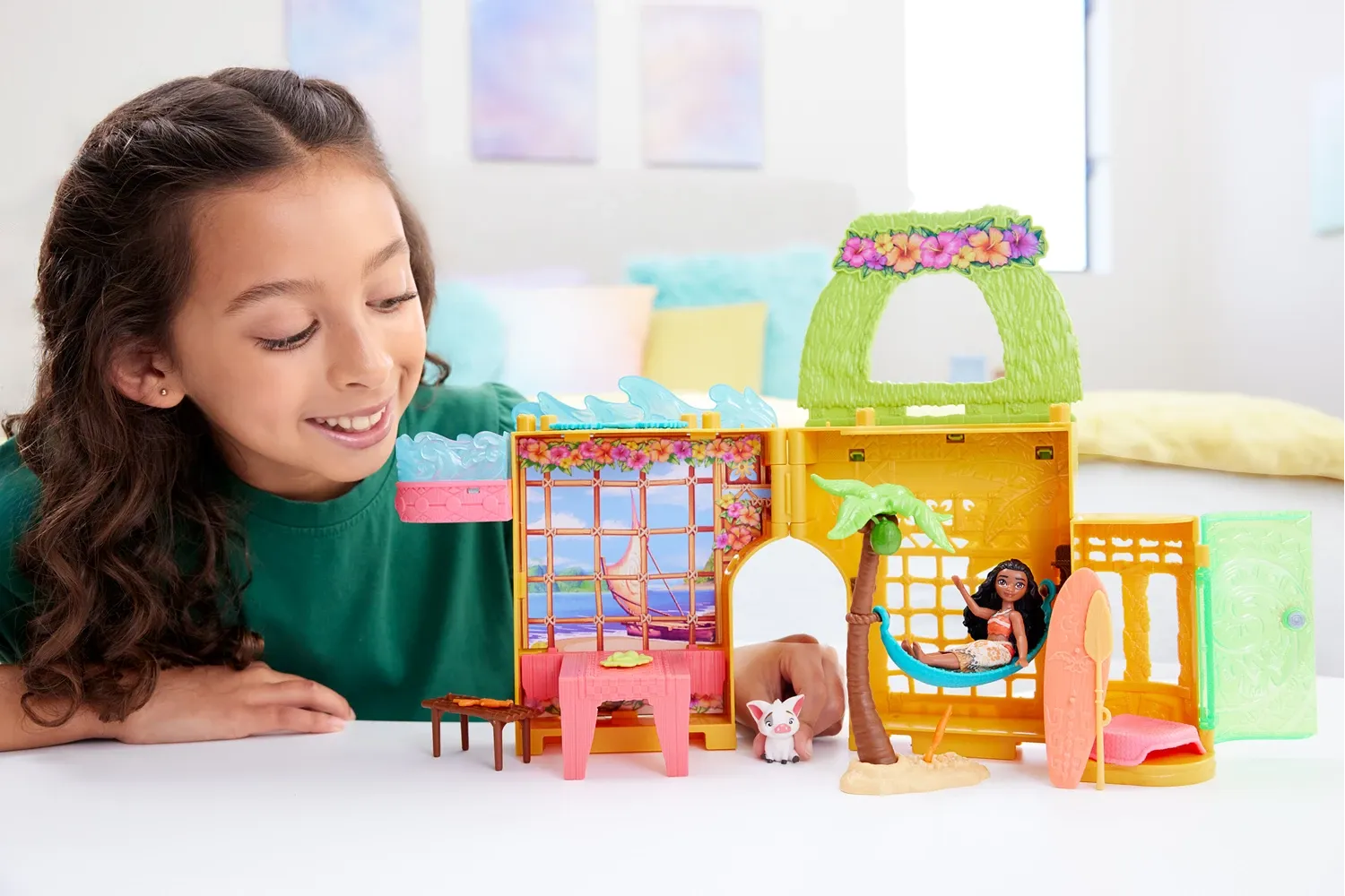 Das Spielset lässt sich öffnen. Die Spielbereiche umfassen ein Esszimmer, einen Aussenbereich und ein verstecktes Zimmer für Vaianas Tierfreund, mit Zubehör. Die bewegliche Vaiana-Puppe (ca. 9 cm) trägt einen abnehmbaren, weichen Rock.