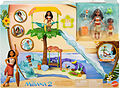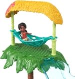 5 Spielbereiche: eine Hängematte, eine Schaukel, eine Welle, eine Wasserrutsche und ein Picknickbereich. Kinder können ihre Abenteuerlust ausleben und die kleine Vaiana- oder Simea-Puppe auf der Welle reiten und unter den Bäumen schaukeln.