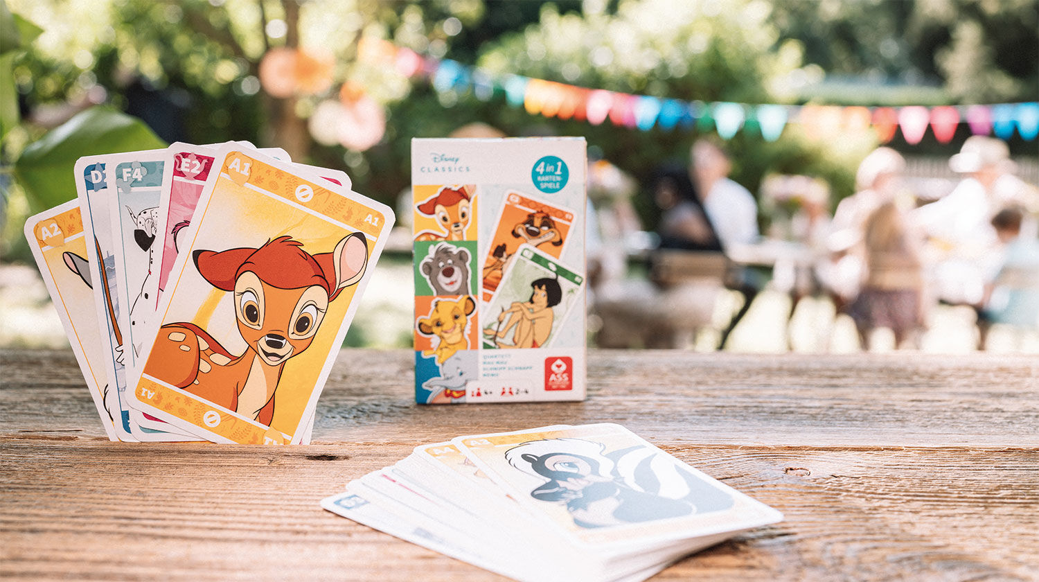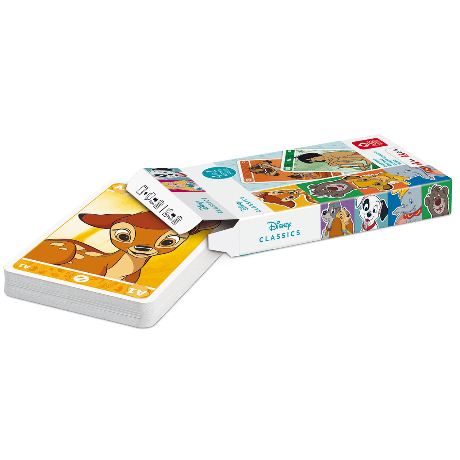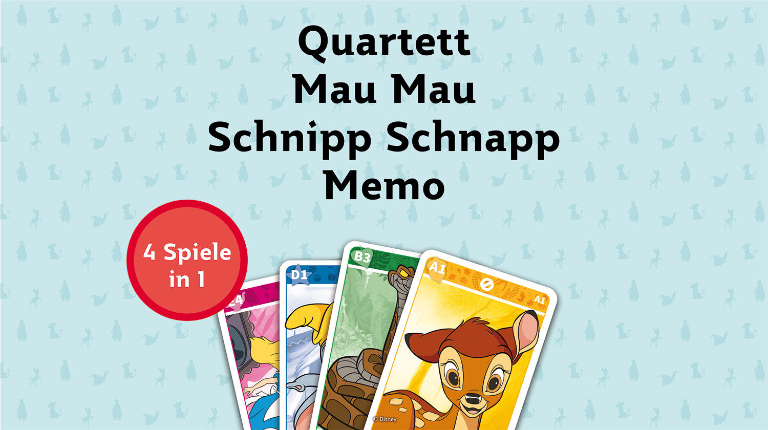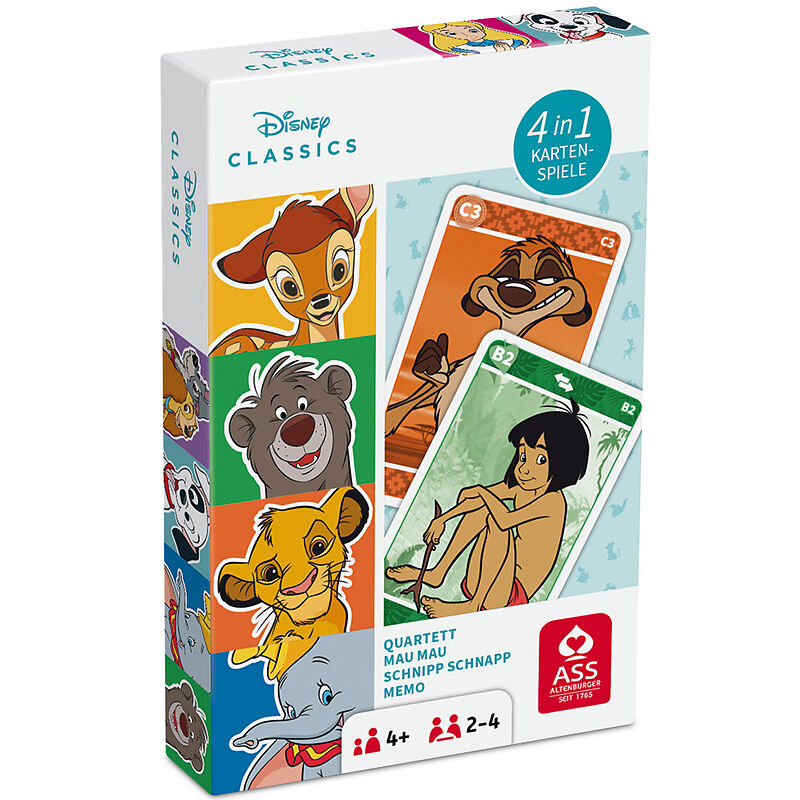 Kinder ab 4 Jahren können mit den Disney Klassikern ein Spielchen wagen. Das liebevoll gestaltete Kartenset umfasst vier verschiedene Spiele: Quartett, Mau Mau, Schnipp Schnapp und Memo. Wer wird am Ende als Sieger vom Tisch gehen?