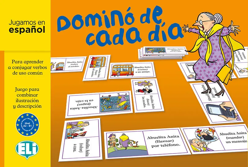 Lernen Sie Vokabeln und Grammatikstrukturen, die mit alltäglichen Handlungen in Verbindung stehen. Das Spiel erlaubt es den Spielern, regelmäßige und unregelmäßige Verben in der Gegenwart, Vergangenheit und Zukunft zu verwenden. Jeder Domino hat eine illustri...