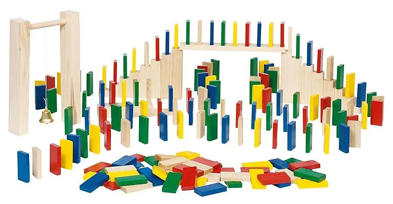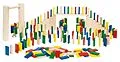 Jetzt kommt Bewegung ins Kinderzimmer! Mit der einzigartigen Domino-Rallye aus bunten Holzbausteinen und Klötzen lassen sich interessante Varianten bauen. Haben die Steine ihr Ziel erreicht, klingelt ein Glöckchen. Stein: 1,9 x 4,3 x 0,5 cm