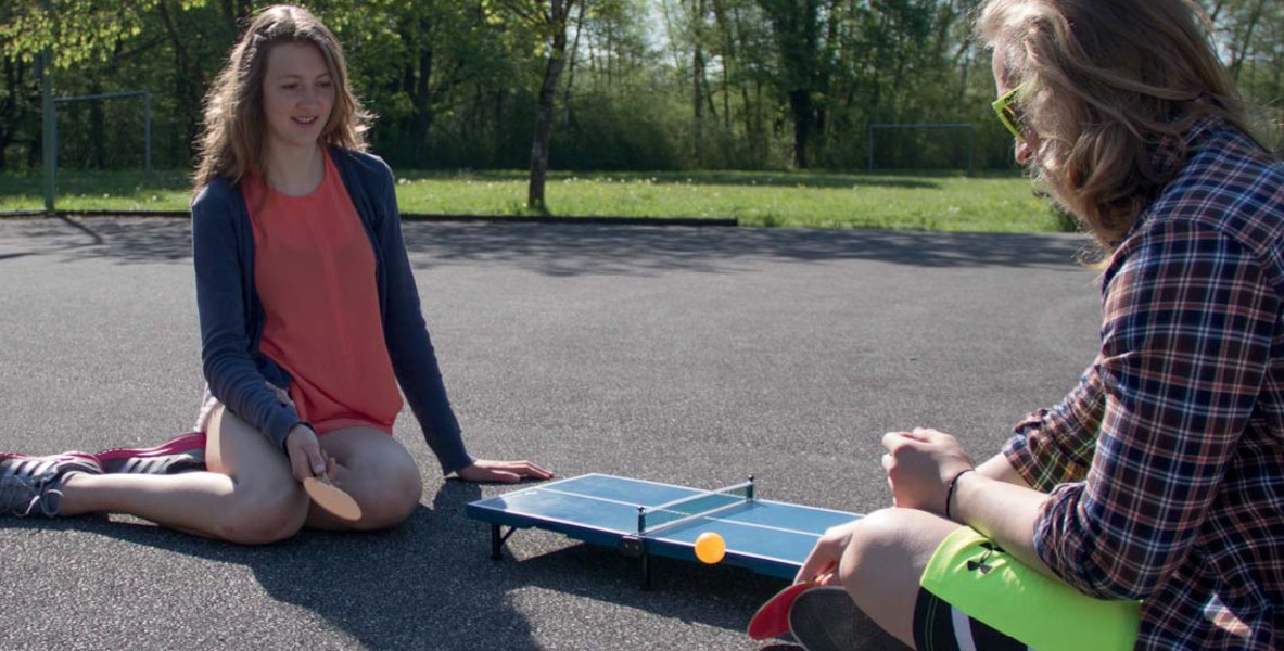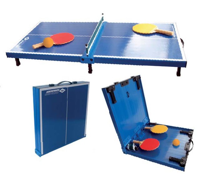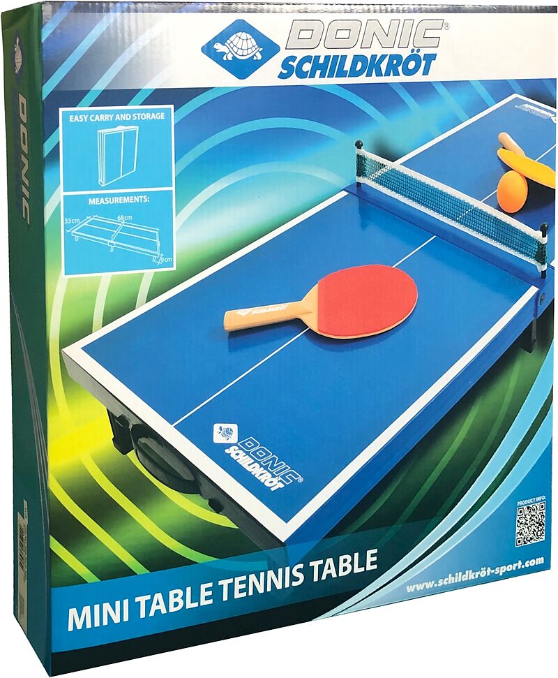 Minitisch mit Kunststoffoberfläche mit Tragegriff, Netz, 2 Mini-Schläger aus PVC und 1x Ball.