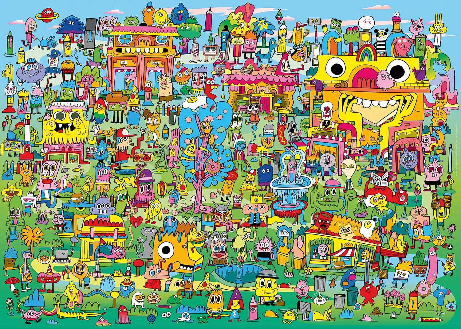 Hier wohnen sie also, die knuffig-bunten Doodle-Wesen, die Jon Burgerman mit ungezügelter Fantasie aufs Blatt bringt. Dieses Village ist definitiv eine Puzzle-Reise wert! Gelegte Größe: 70x50 cm.