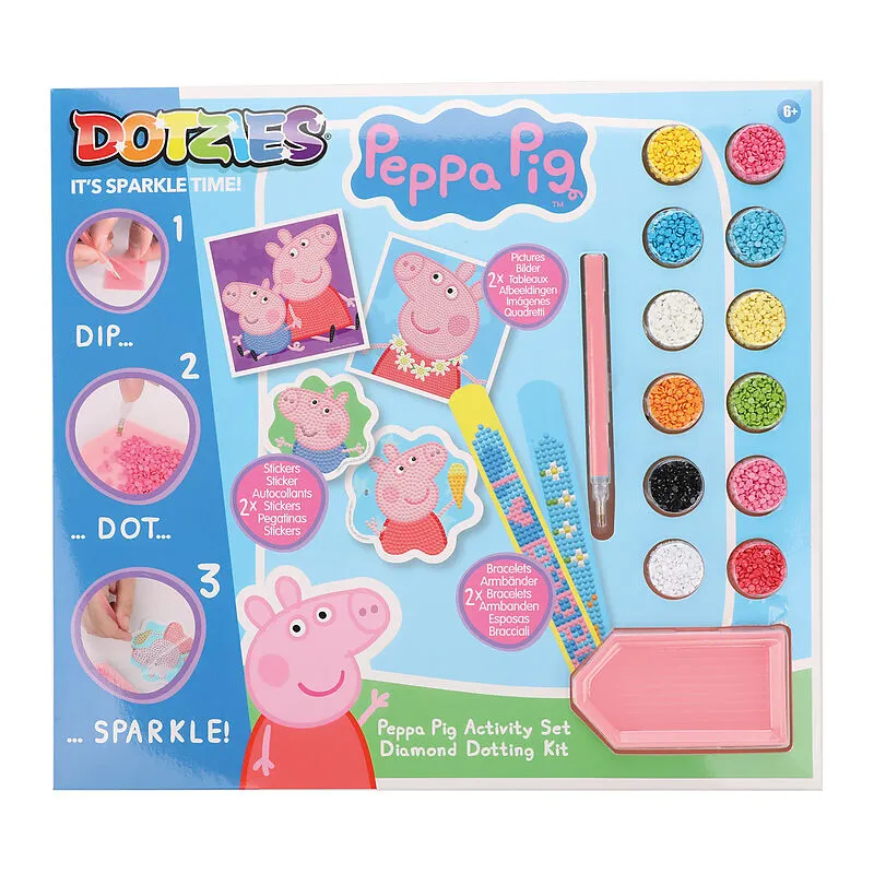 DOTZIES® Original Diamond Painting Set Peppa Pig mit 6 Motiven: 2 Bilder 15 x 15 cm, 2 Armbänder, 2 Aufkleber / Sticke DOTZIES® Kreativset Peppa Pig mit 6 Motiven auf je 2 coolen Armbändern, Aufklebern und Bildern mit den beliebten Kindercharakteren! Bringen S...