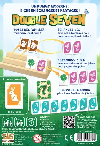 "Un jeu intergénérationnel qui modernise le Rummy avec un twist qui ravira les familles, des enfants aux seniors! Posez, échangez et agrandissez des familles d'animaux. Chaque tuile posée rapporte un point. Et tentez d'obtenir des familles d'au moins 7 tuiles ...