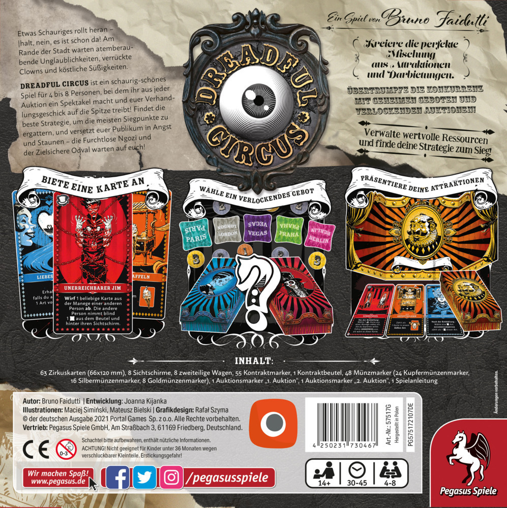 Etwas Schauriges rollt heran halt, nein, es ist schon da! Am Rande der Stadt warten atemberaubende Unglaublichkeiten, verrückte Clowns und köstliche Süßigkeiten. Dreadful Circus ist ein schaurig-schönes Kennerspiel von Bruno Faidutti für 4 bis 8 Personen, bei ...