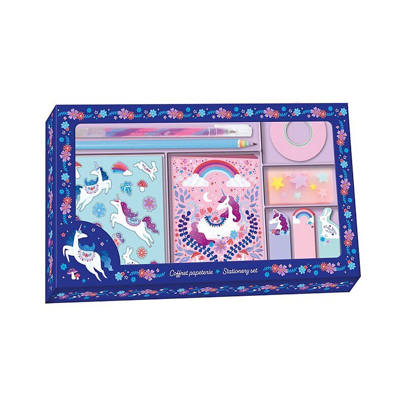 Ein komplettes Set für die ersten Schreibversuche! Dieses Schreibwaren-Set enthält alles, was kleine Schreibanfänger benötigen: 1 Heft mit 24 linierten und illustrierten Seiten, 3 Sticker-Bogen, 3 Haftnotizblöcke, 1 Rolle wiederverwendbares Klebeband, 1 Radier...