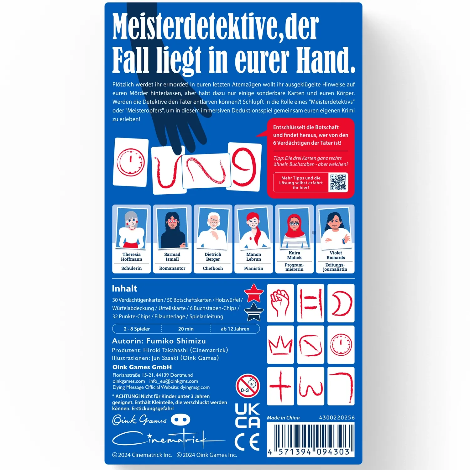 Meisterdetektive, der Fall liegt in eurer Hand. Plötzlich werdet ihr ermordet! In euren letzten Atemzügen wollt ihr ausgeklügelte Hinweise auf euren Mörder hinterlassen, aber habt dazu nur einige sonderbare Karten und euren Körper. Werden die Detektive den Tät...