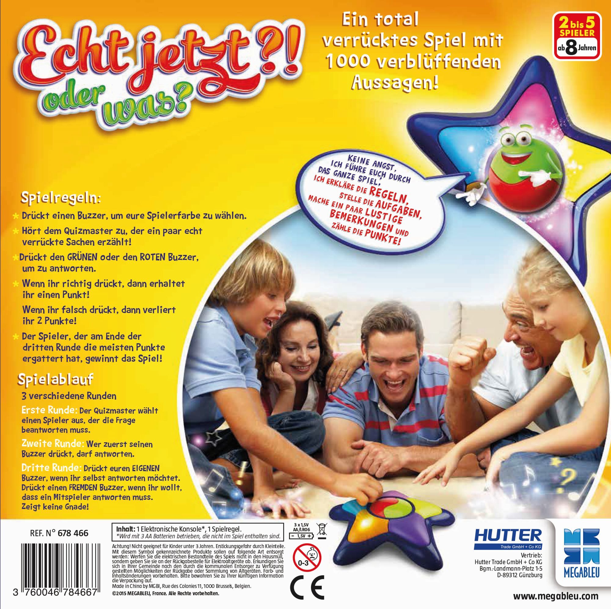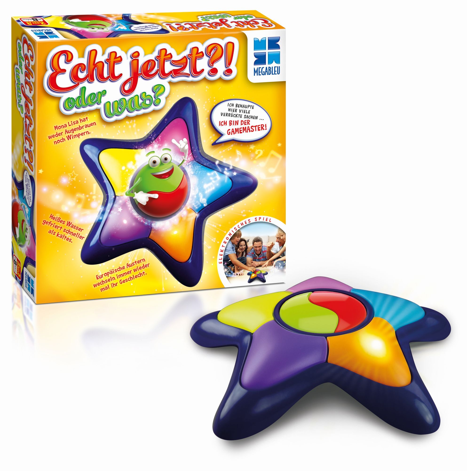 Mega Bleu Echt jetzt?! Ein Druck auf den Buzzer bringt eine von über 1.000 Quizfragen. Der elektronische Gamemasterr leitet durchs Spiel, stellt die Fragen, zählt die Siegpunkte und kommentiert die Partie. Auch Bonuspunkte gibt es beim ihm zu ergattern - wenn ...