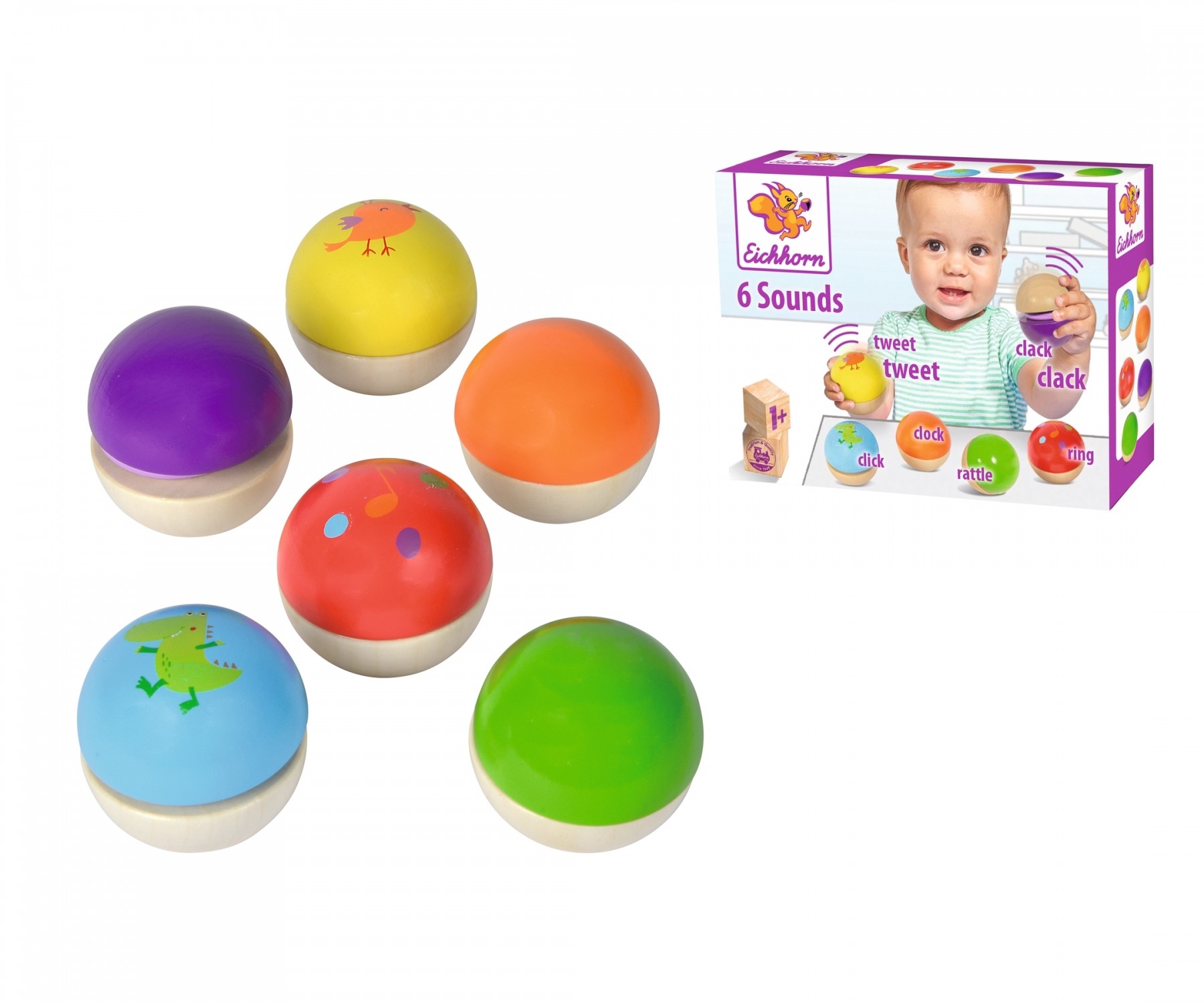 Eichhorn Sound Kugeln: Die sechs bunt gestalteten Sound Kugeln von Eichhorn machen sechs verschiedene Sounds. Diese sind mit Kügelchen, einem Glöckchen oder anderen Dingen bestückt. Dadurch wird die Akustik, die Motorik und die Hand-Augen-Koordination Ihres Ki...