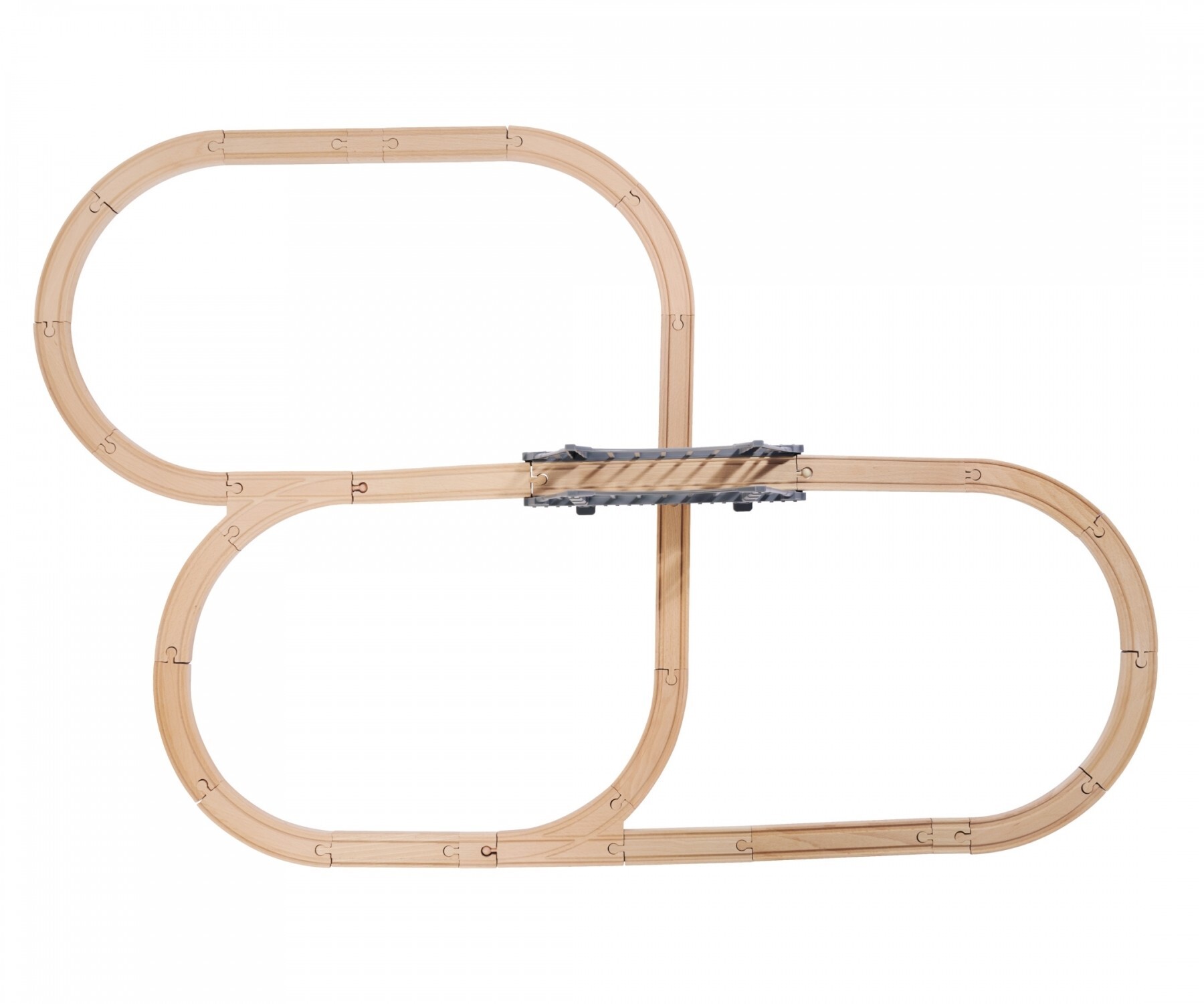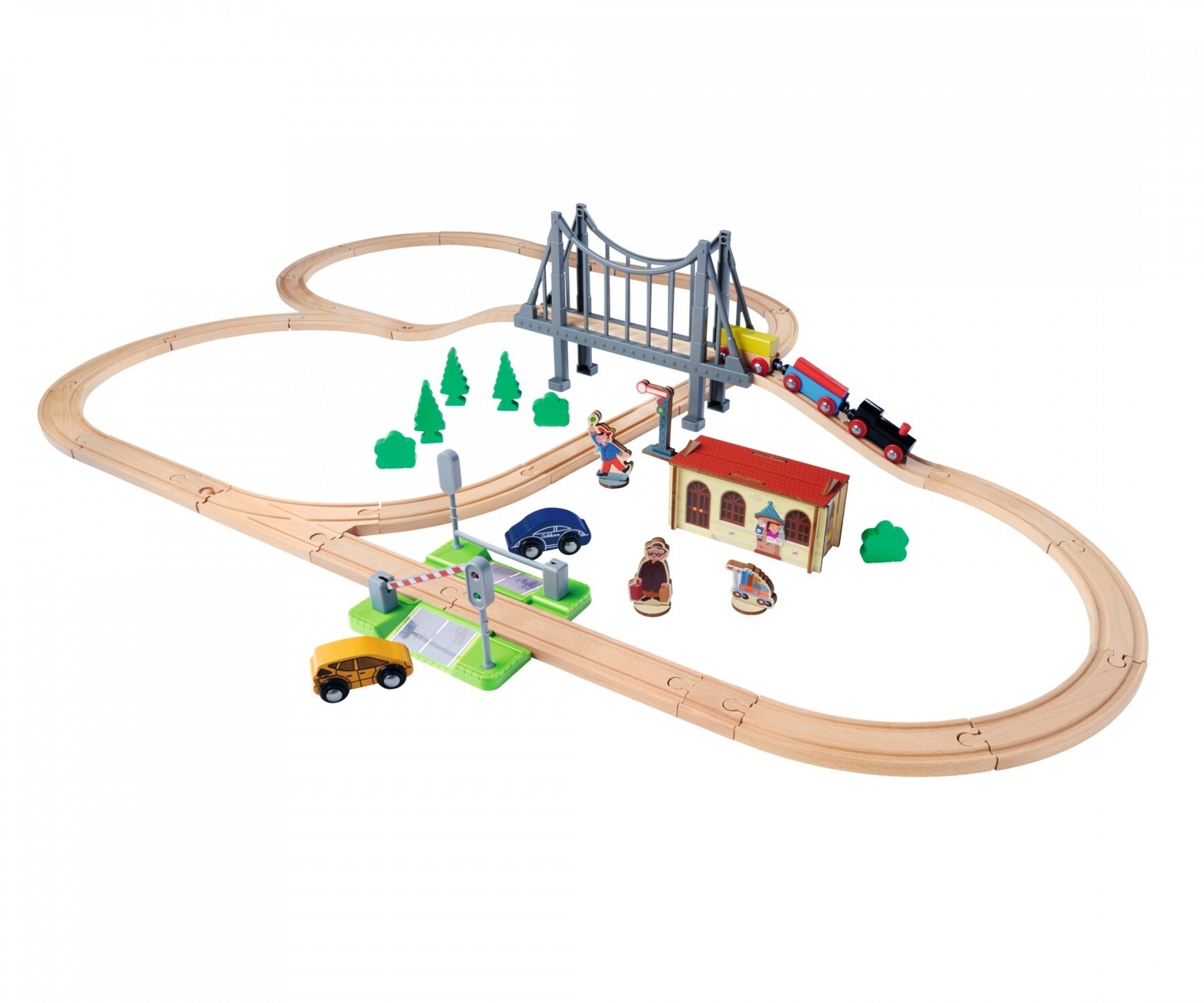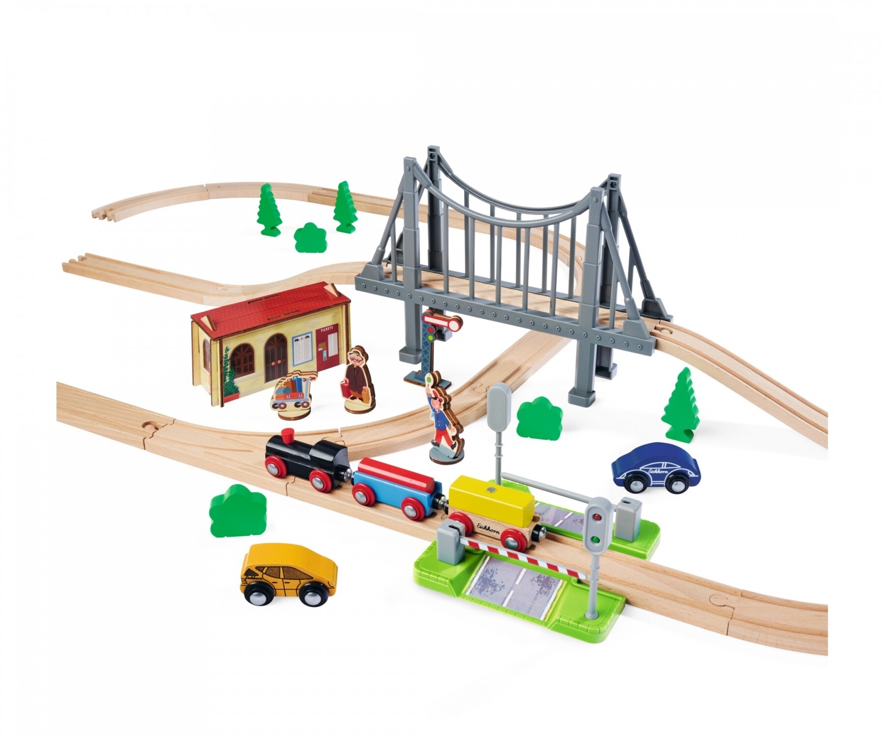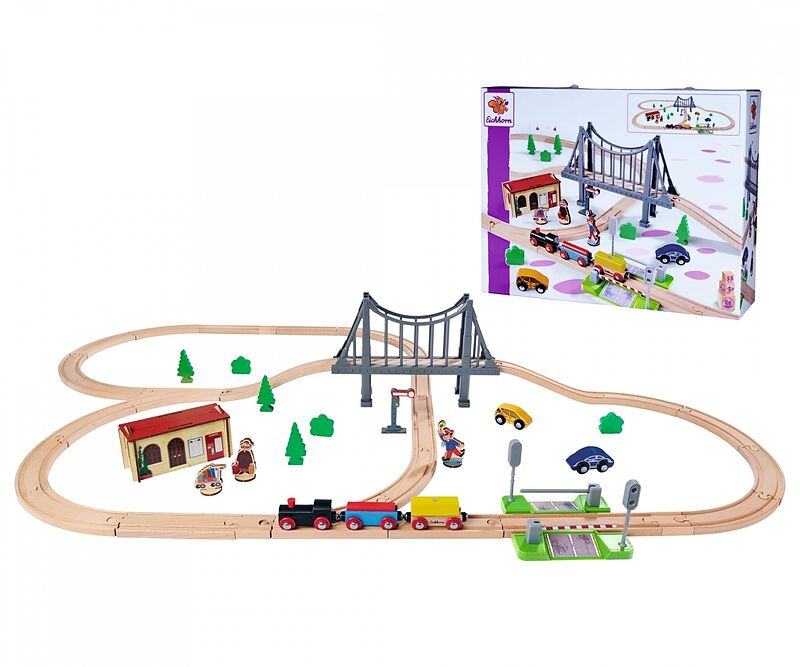 Eichhorn Bahn, Bahnset mit Brücke, 55-tlg.: Das Eichhorn "Bahnset mit Brücke" hat eine Gesamtlänge von 500cm. Im Set sind Schienen, Bergschienen, Weichen, Schilder, Bäume, Häuser, ein Auto, ein Übergang und ein 5-teiliger Zug enthalten. Für die Herstellung der...