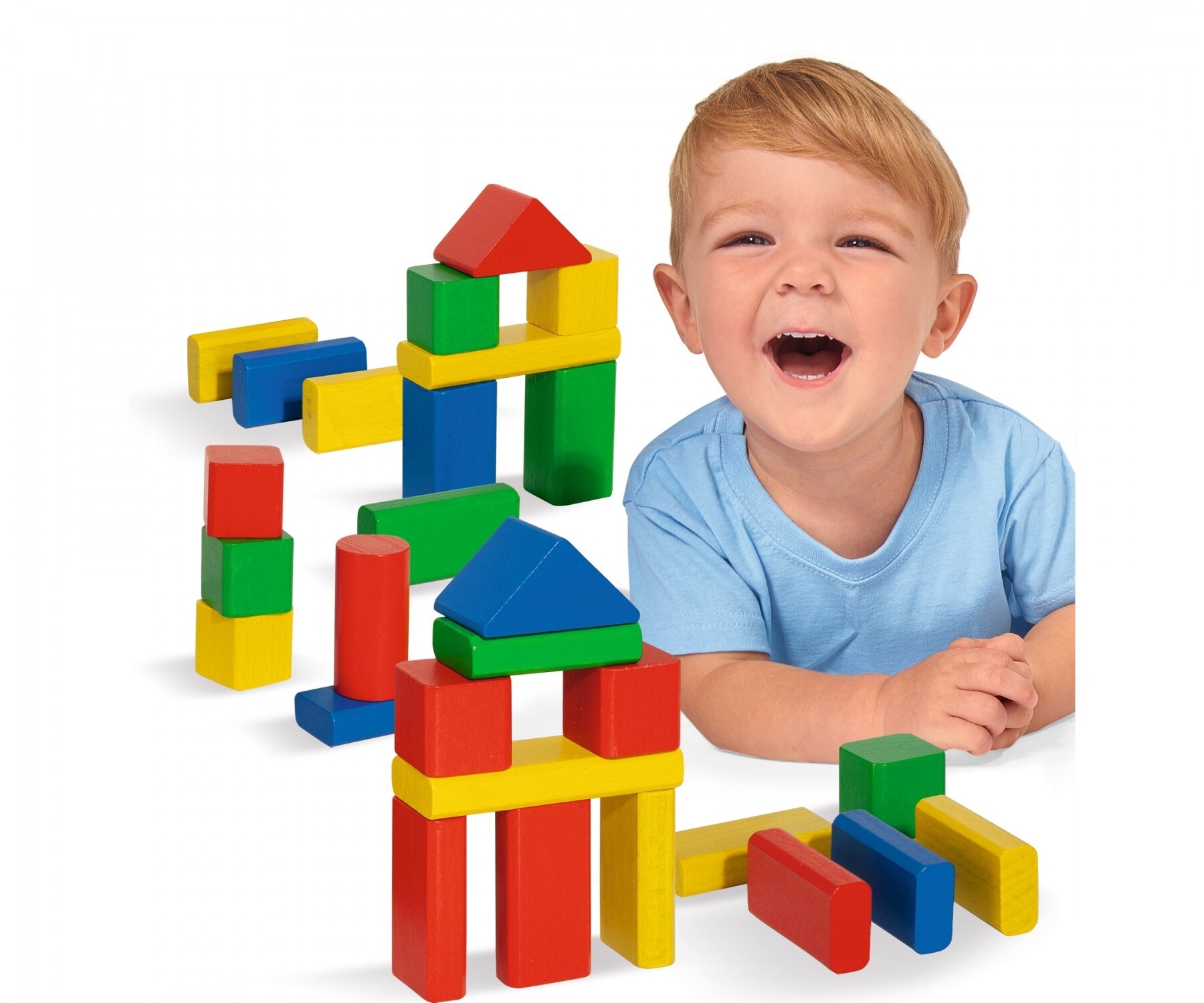 Mit den 50 bunten Holzbausteine von Eichhorn können die Kleinen sich ihre eigene kleine Welt bauen. Unterschiedliche Formen, wie Säulen und Blöcke können nach Belieben gestapelt und sortiert werden. Besonders praktisch ist die Aufbewahrungsbox mit Kordel und S...