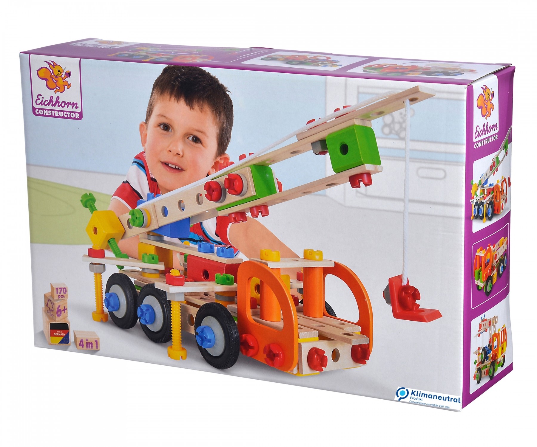 Eichhorn Constructor 170-tlg.: Aus dem Eichhorn Constructor Set können mit den 170 Teilen vier Modellvarianten zusammengeschraubt werden: ein Kranwagen, ein Abschleppwagen, ein LKW-Kipper und ein Jeep. Mit Hilfe der mitgelieferten Werkzeuge, der Anleitung und ...