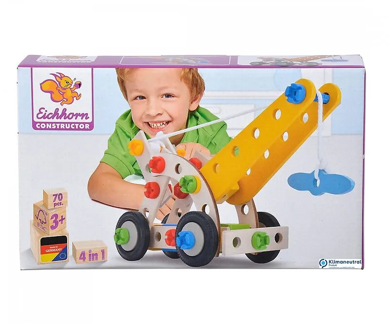 Eichhorn Constructor, Kranwagen: Aus dem 65-teiligem Eichhorn Constructor Set ""Kranwagen"" werden mit Schraubenschlüssel und Schraubendreher nach Anleitung eines der vier tollen Modelle gebaut: Kranwagen, Flugzeug, Hubschrauber oder Trike. Natürlich sind der ...