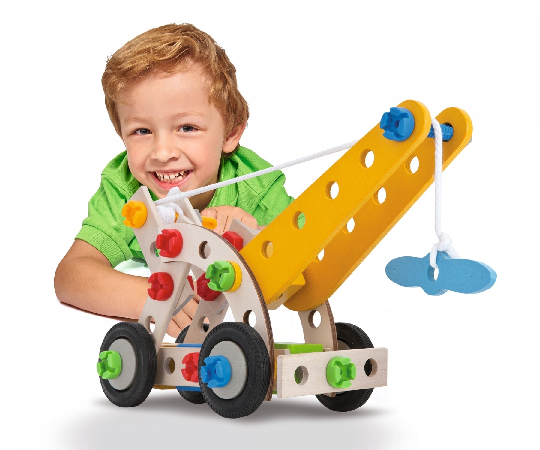 Eichhorn Constructor, Kranwagen: Aus dem 65-teiligem Eichhorn Constructor Set ""Kranwagen"" werden mit Schraubenschlüssel und Schraubendreher nach Anleitung eines der vier tollen Modelle gebaut: Kranwagen, Flugzeug, Hubschrauber oder Trike. Natürlich sind der ...
