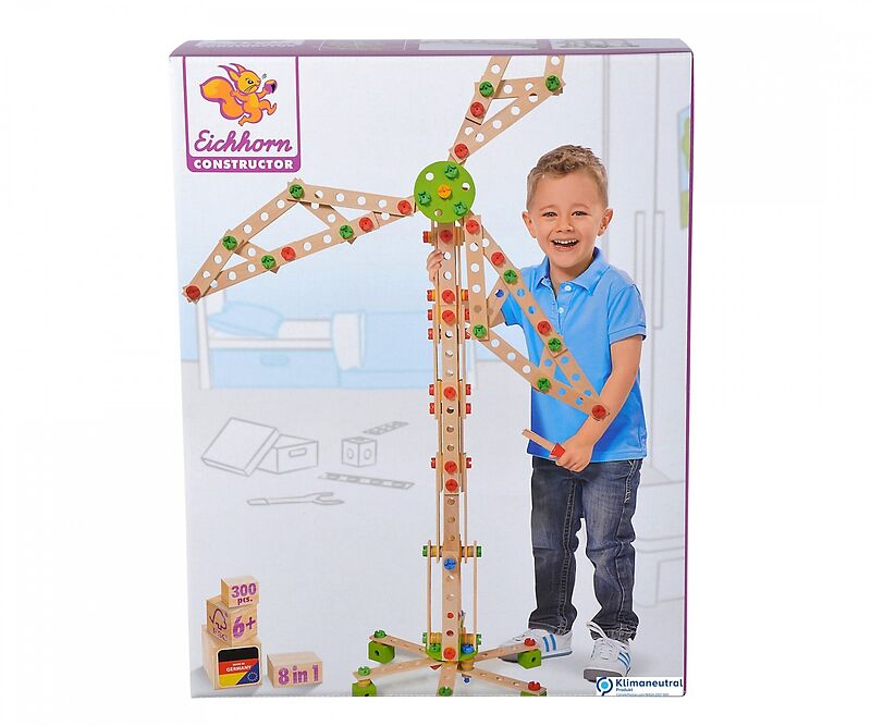 Eichhorn Constructor 300-tlg.: Aus dem 300-teiligen Eichhorn CONSTRUCTOR Set können acht Modelle zusammengeschraubt werden: ein Windrad, Kran, Katamaran, Flugzeug, Rennwagen, Kampfjet, Brücke oder ein Hafenkran. Mit Hilfe der mitgelieferten Werkzeuge, der Anle...