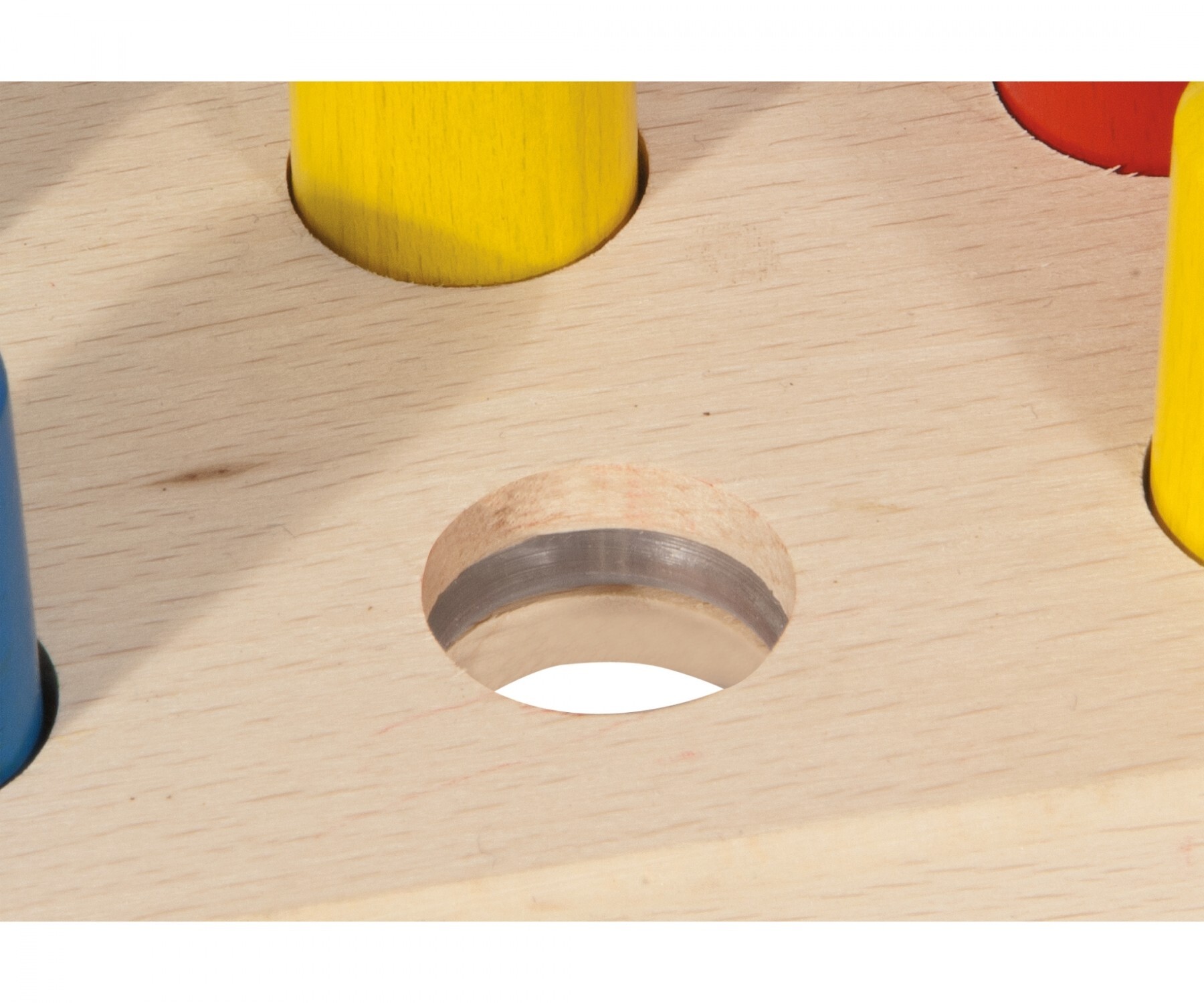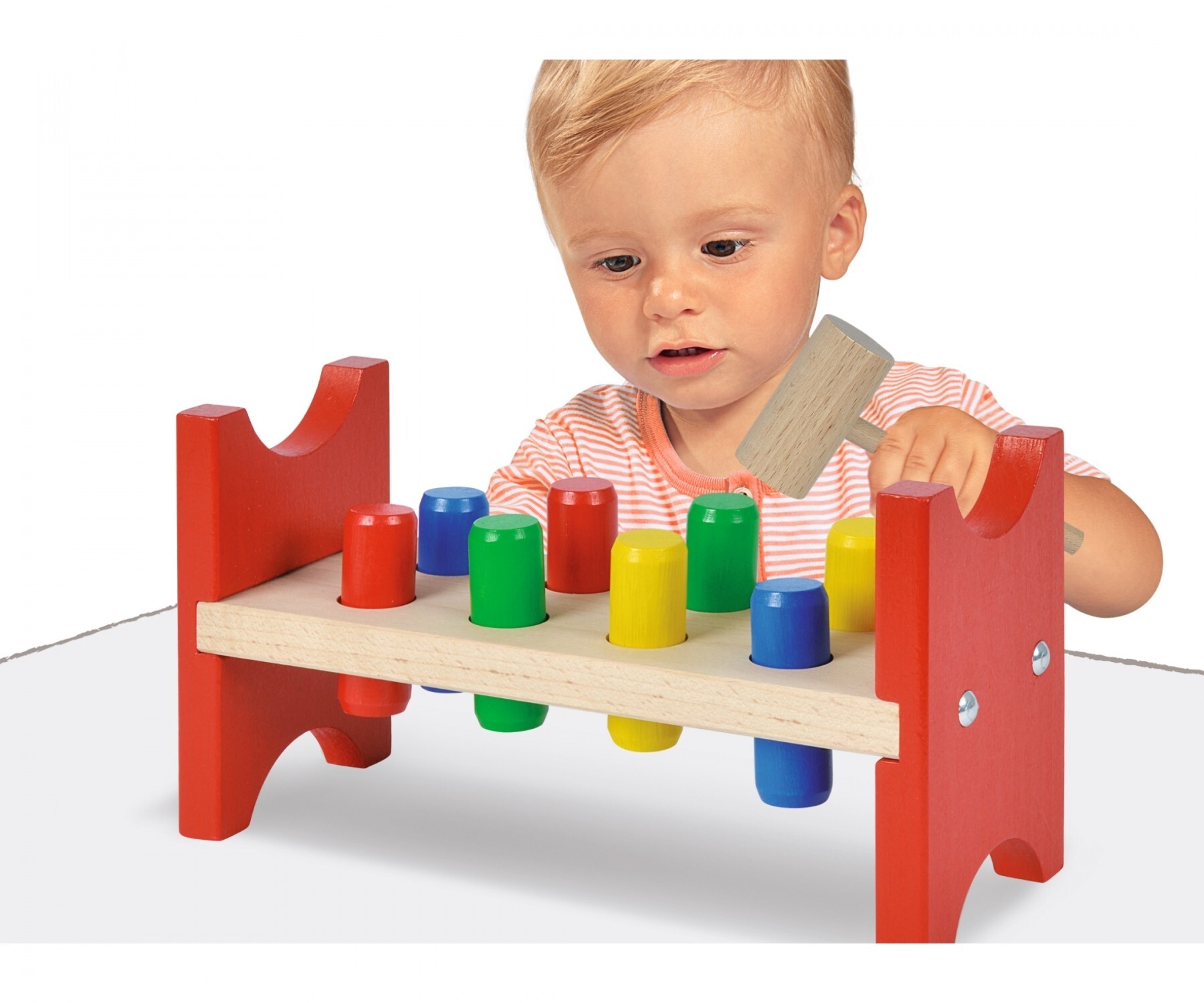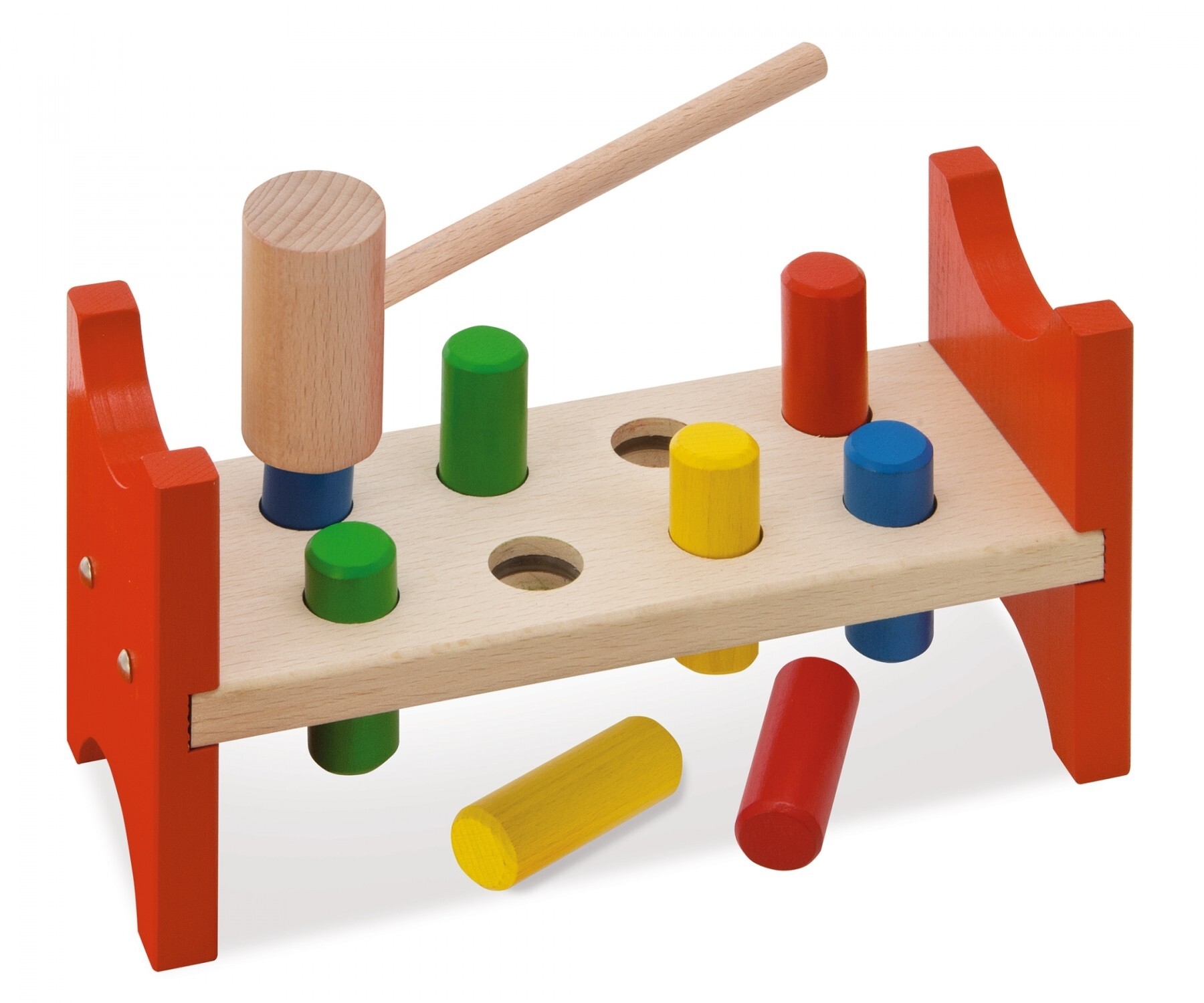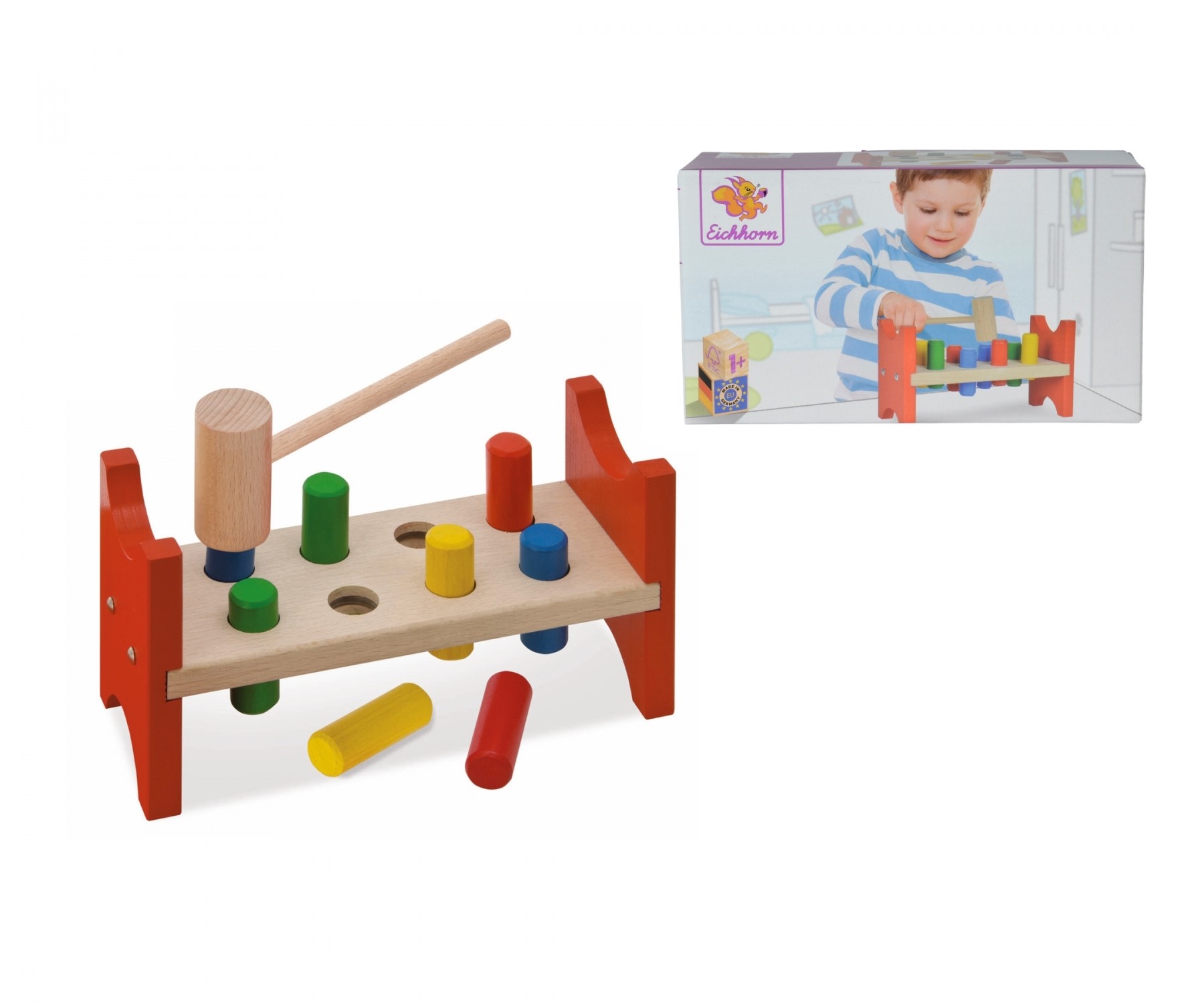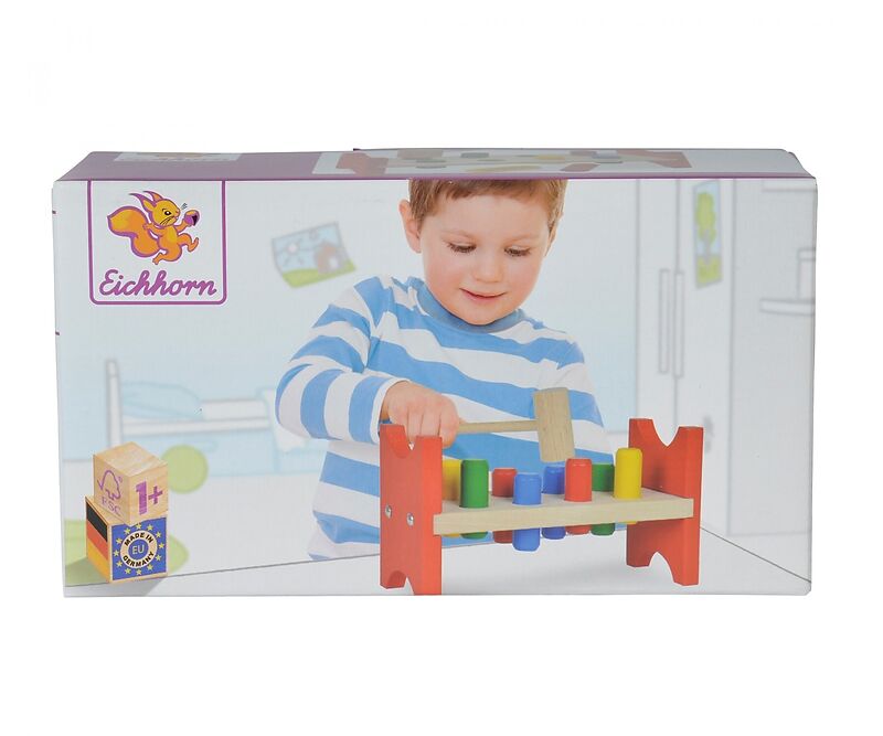 Die 8 bunten Stifte müssen mit dem Hammer durch die Löcher der Heros Klopfbank geschlagen werden. Die Klopfbank fördert die Motorik und ist für Kinder ab einem Jahr geeignet. Hammer, 8x Klopfstifte, 10-tlg., 9x23,5x13cm, FSC® 100%, Buchenholz, BSK, 1J+ Made in...