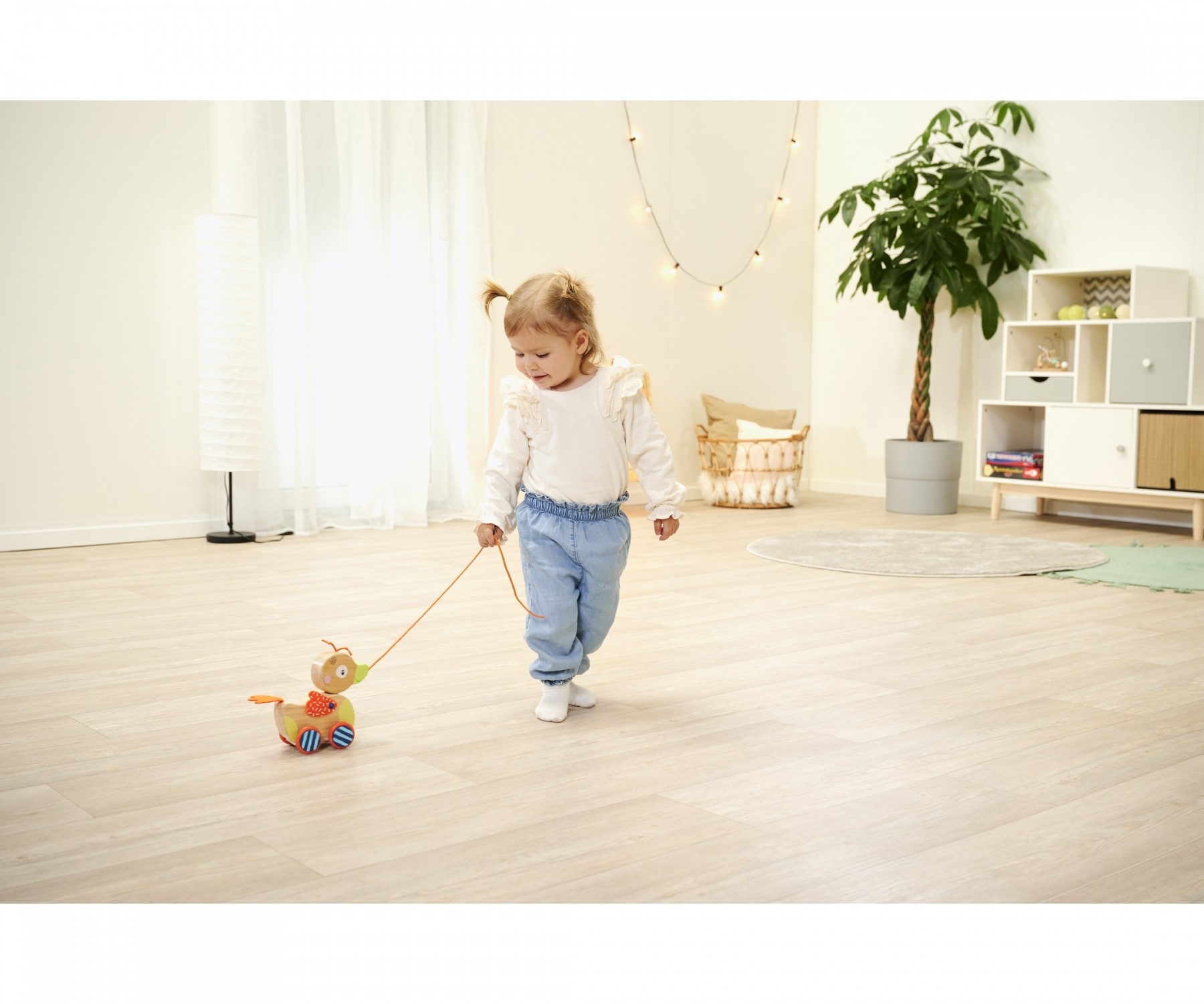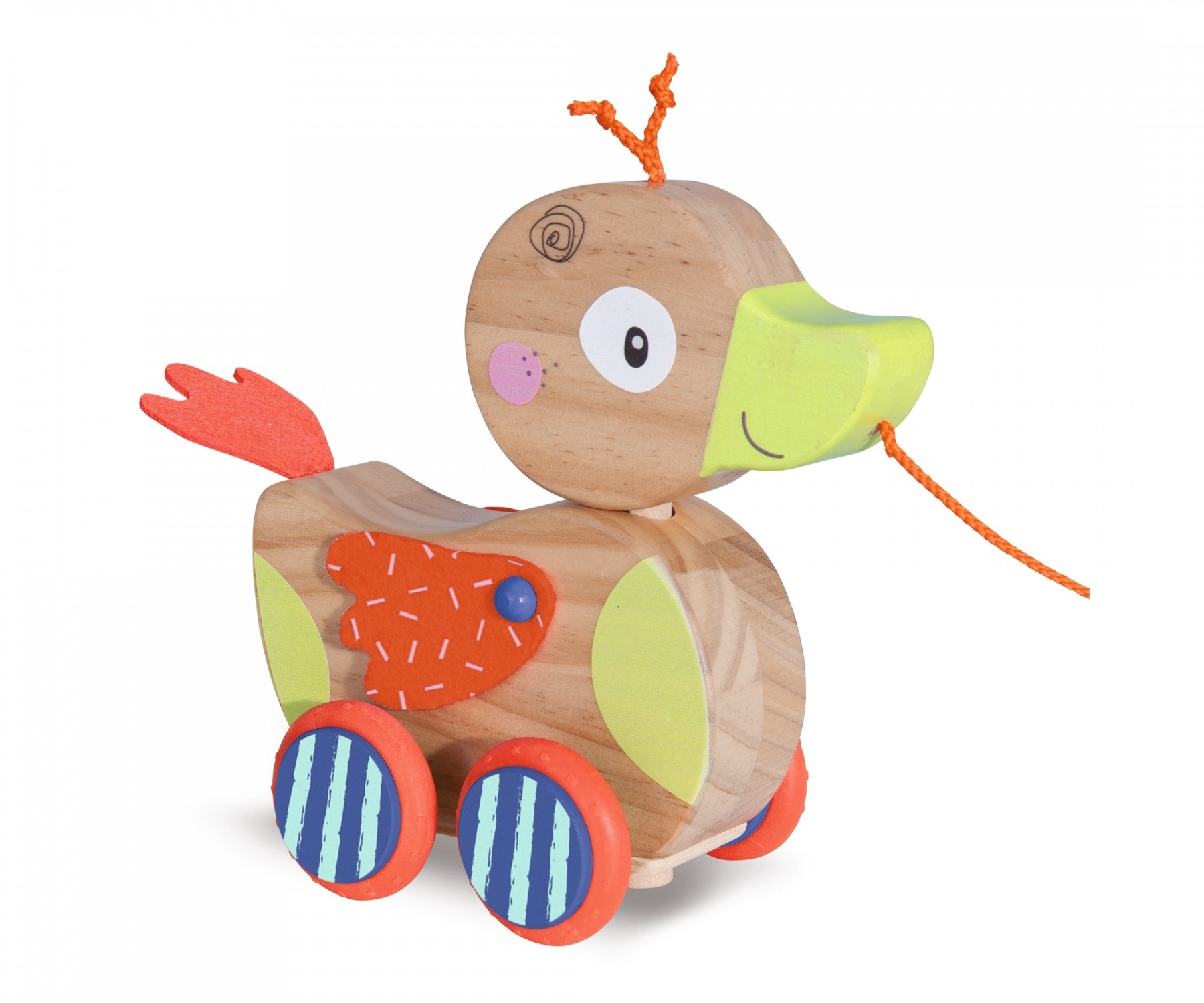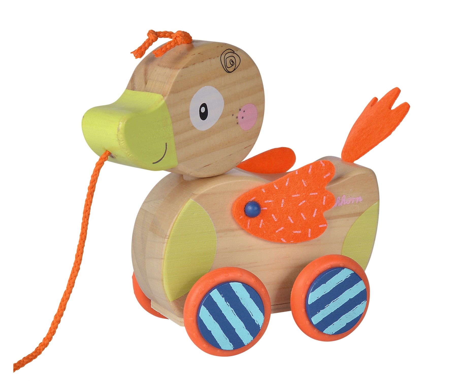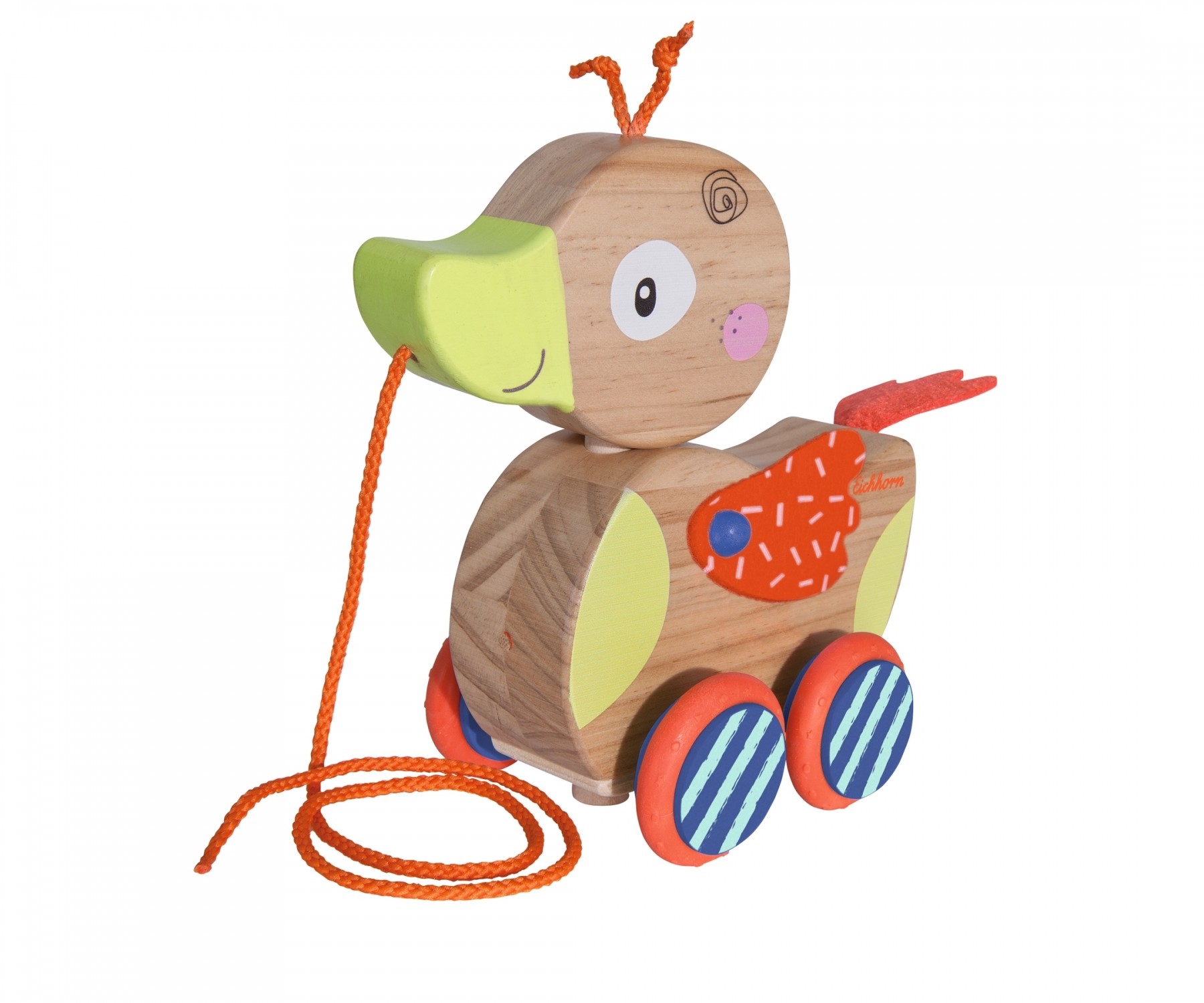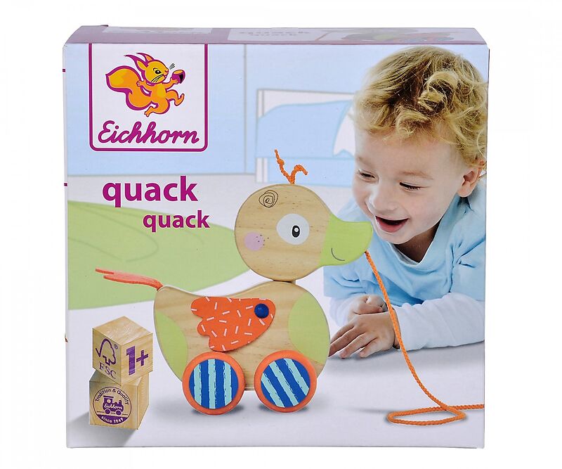 Eichhorn Nachziehente: Die Nachziehente von Eichhorn fördert die Mobilität und die Akustik der Kinder. Sobald die Nachziehente gezogen wird macht Sie Geräusche und der Kopf bewegt sich. Durch die Gummilaufflächen auf den Rädern ist das Nachziehtier geräuschlos...