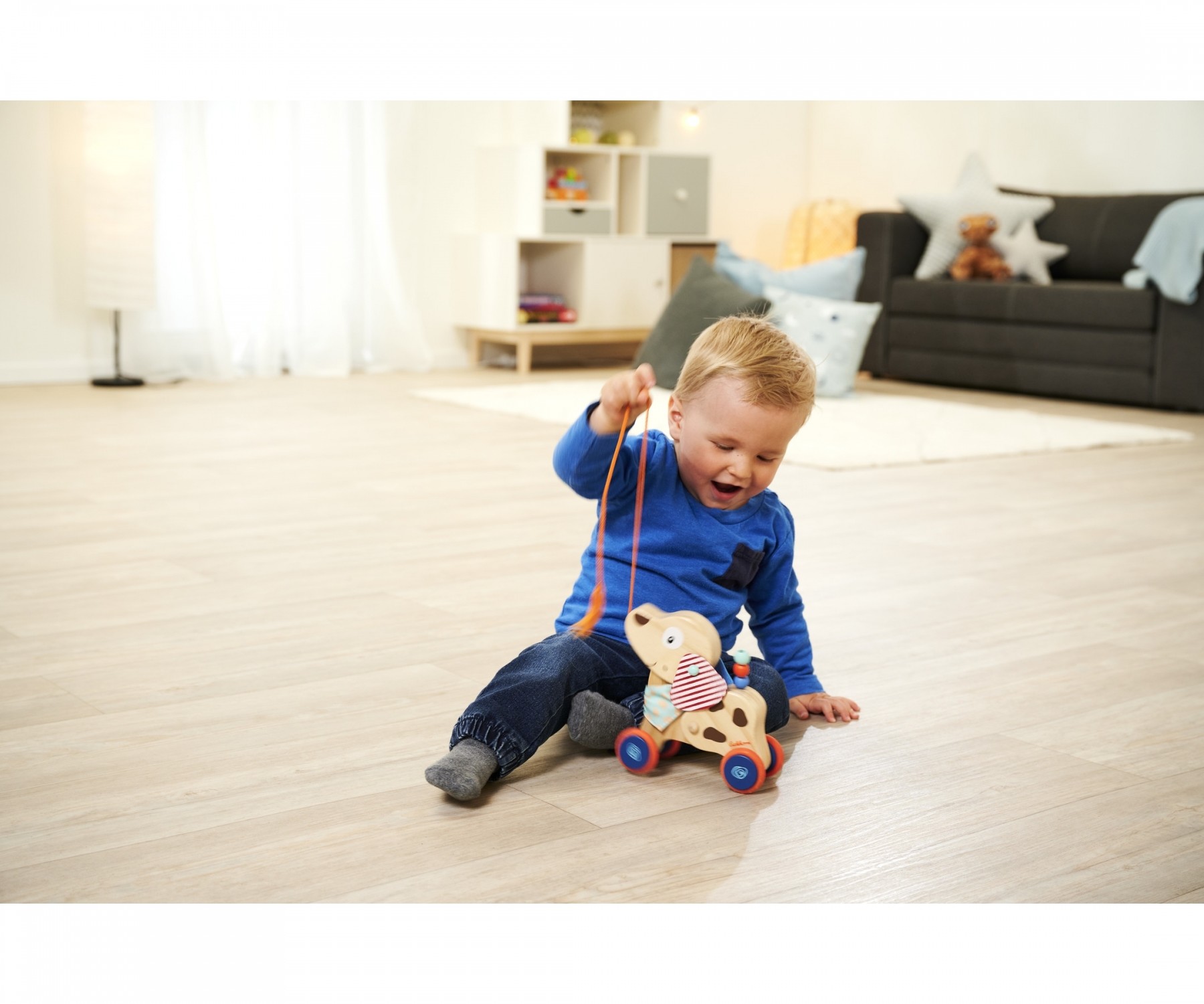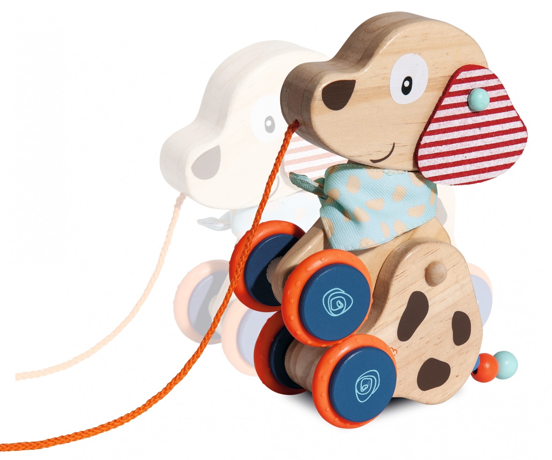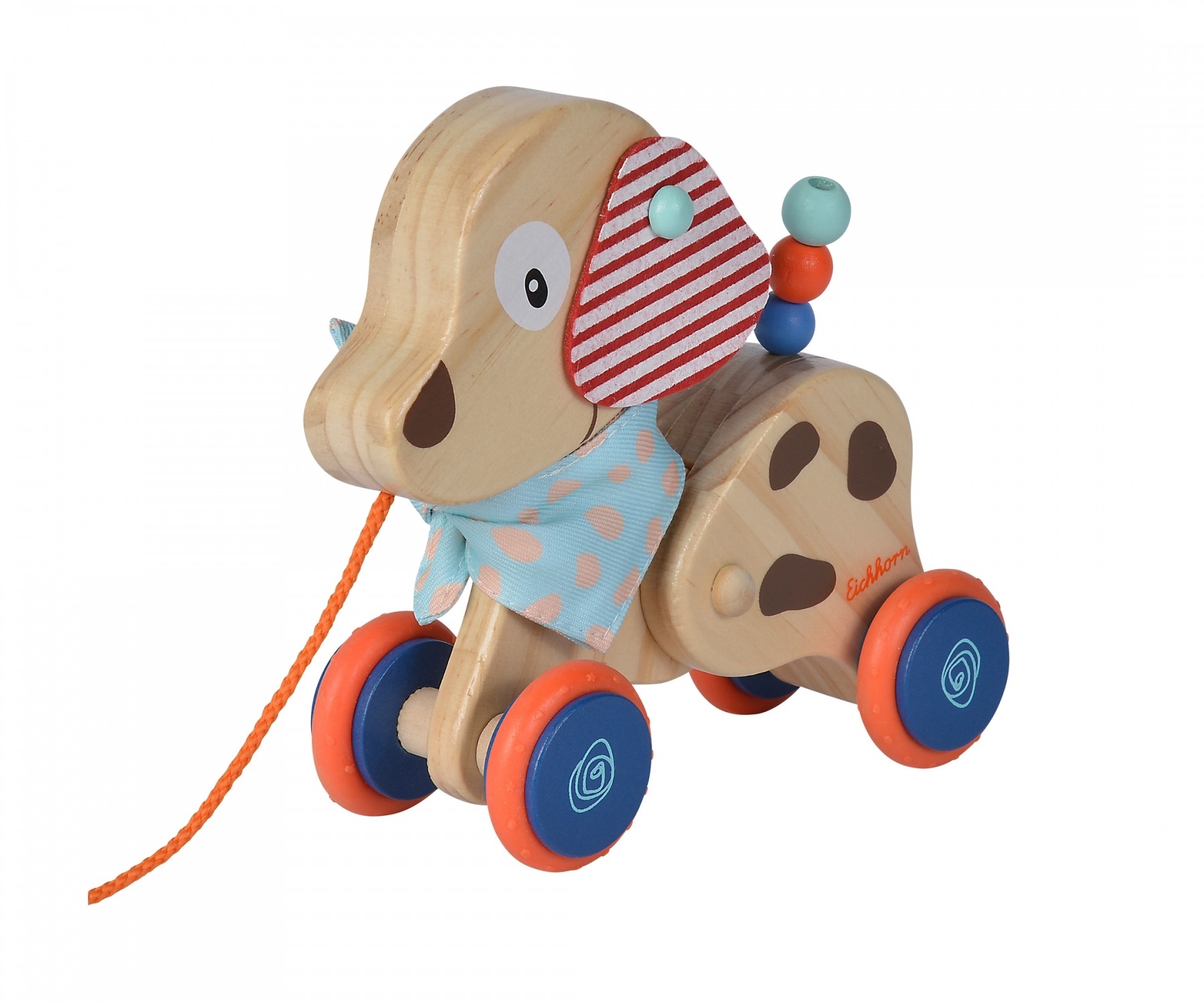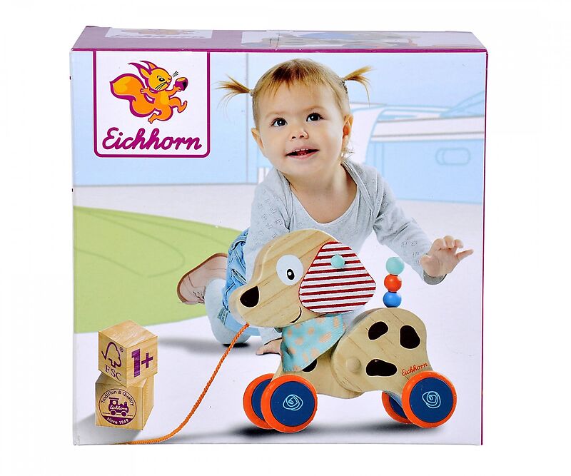 Eichhorn Nachziehhund: Der Nachziehhund von Eichhorn fördert die Mobilität der Kinder. Der Hund kann durch seinen beweglichen Körper hingesetzt werden. Die Gummilaufflächen auf den Rädern hinterlassen keine Spuren und sind geräuschlos. Für die Herstellung der ...