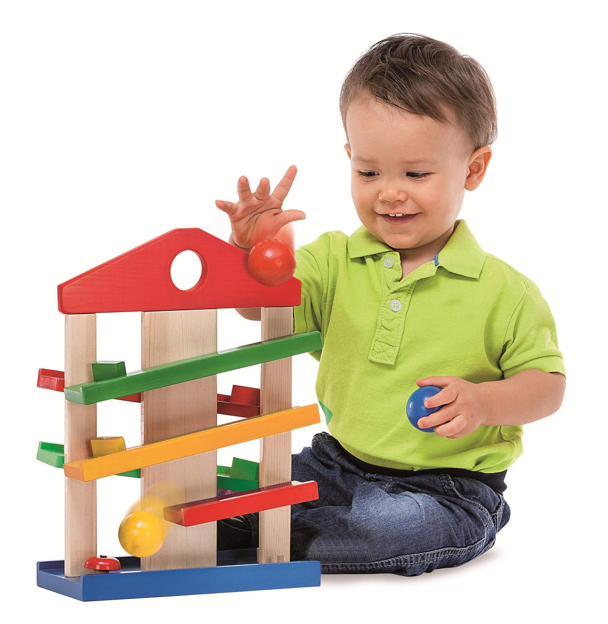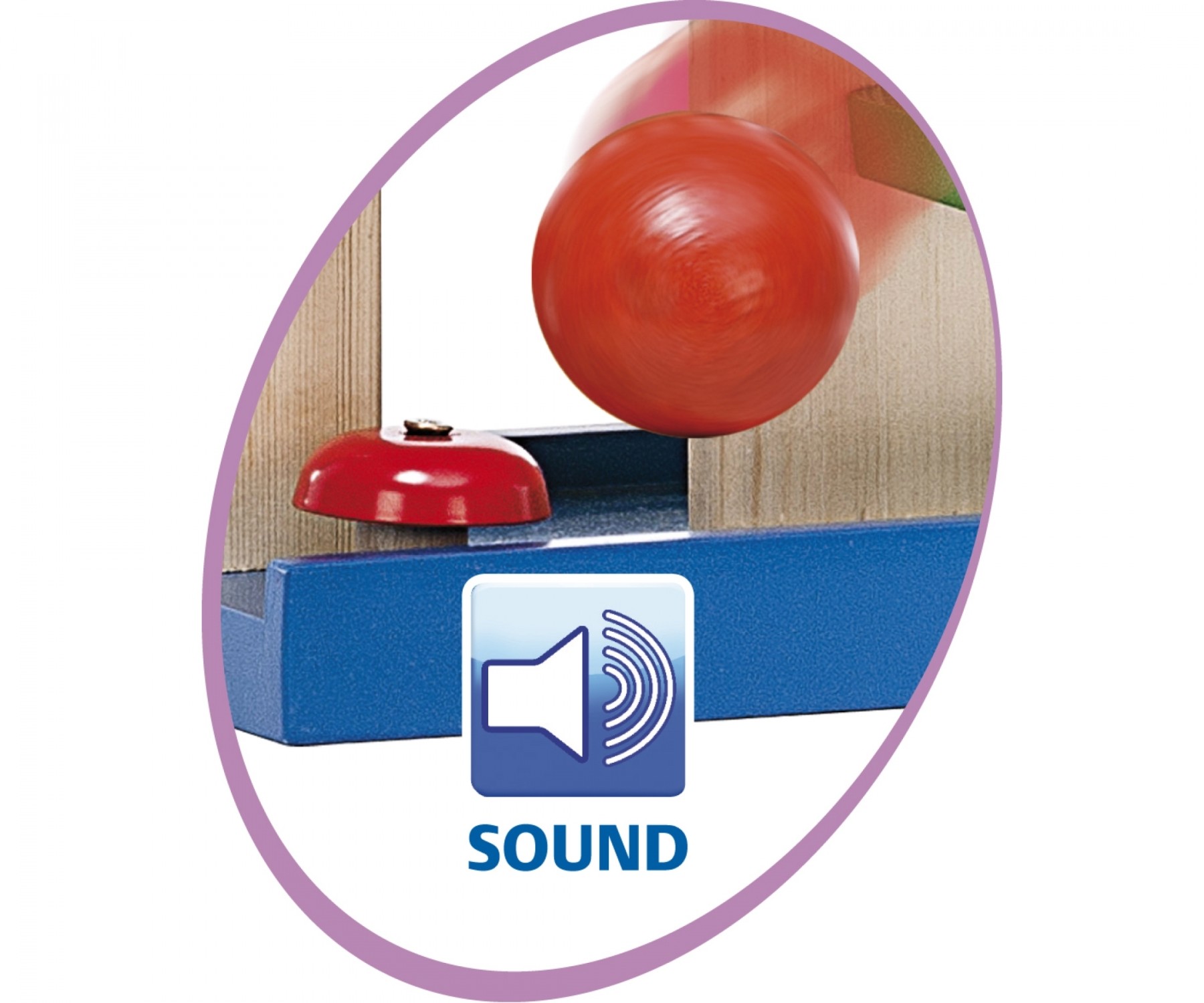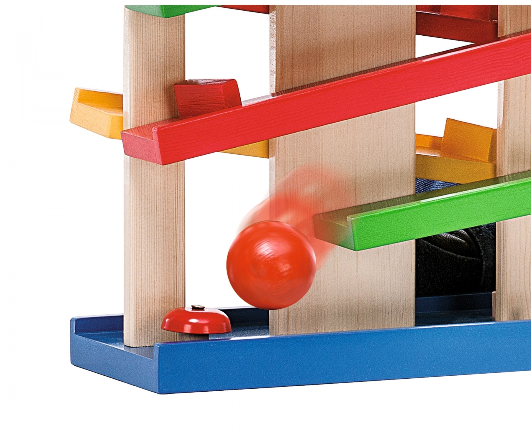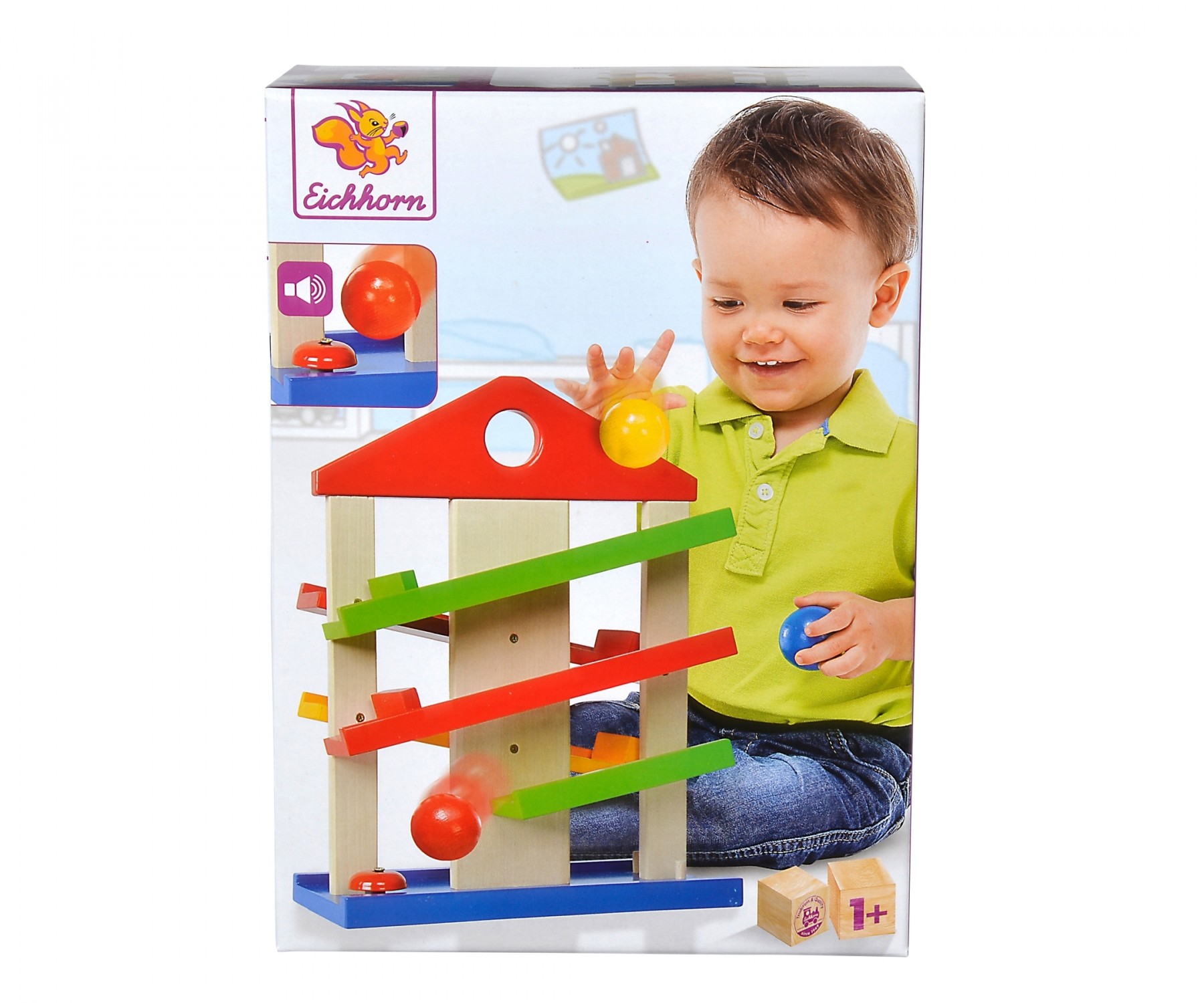 Das kunterbunte Kugelbahnhaus von Eichhorn sollte in keiner Kinderstube fehlen. Das Haus umfasst eine Größe von 25x12x34cm und beim Rollen der Kugeln von oben nach unten auf 5 Schienen staunen kleine Kinderaugen. Die kullernden bunten Holzkugeln läuten die Glo...