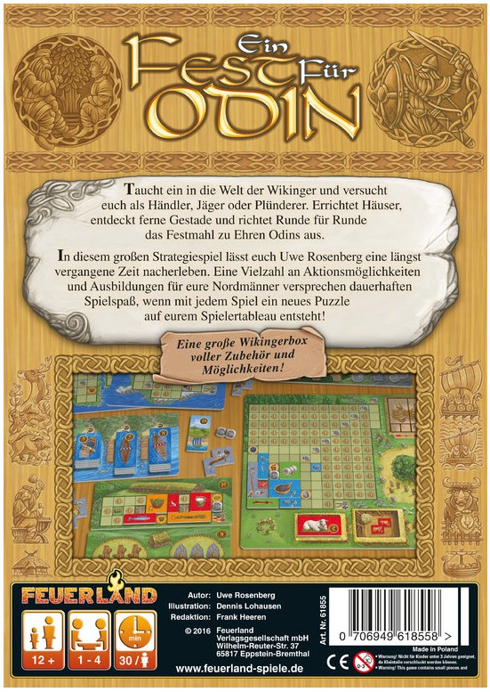 Ein großes Spiel verdient eine große Box - Werdet zum Wikinger und erkundet die Welt!! Uwe Rosenberg hat sich mächtig ins Zeug gelegt und mit Ein Fest für Odin ein Schwergewicht von Strategiespiel erschaffen - sowohl inhaltlich als auch physisch. Über 3kg Mate...