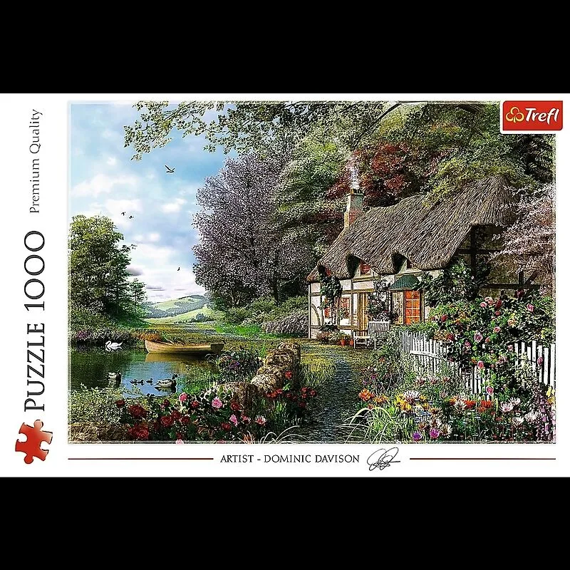 Premium Puzzle mit 1.000 Teilen. Das Motiv zeigt eine Hütte auf einer zauberhaften Lichtung mit See.