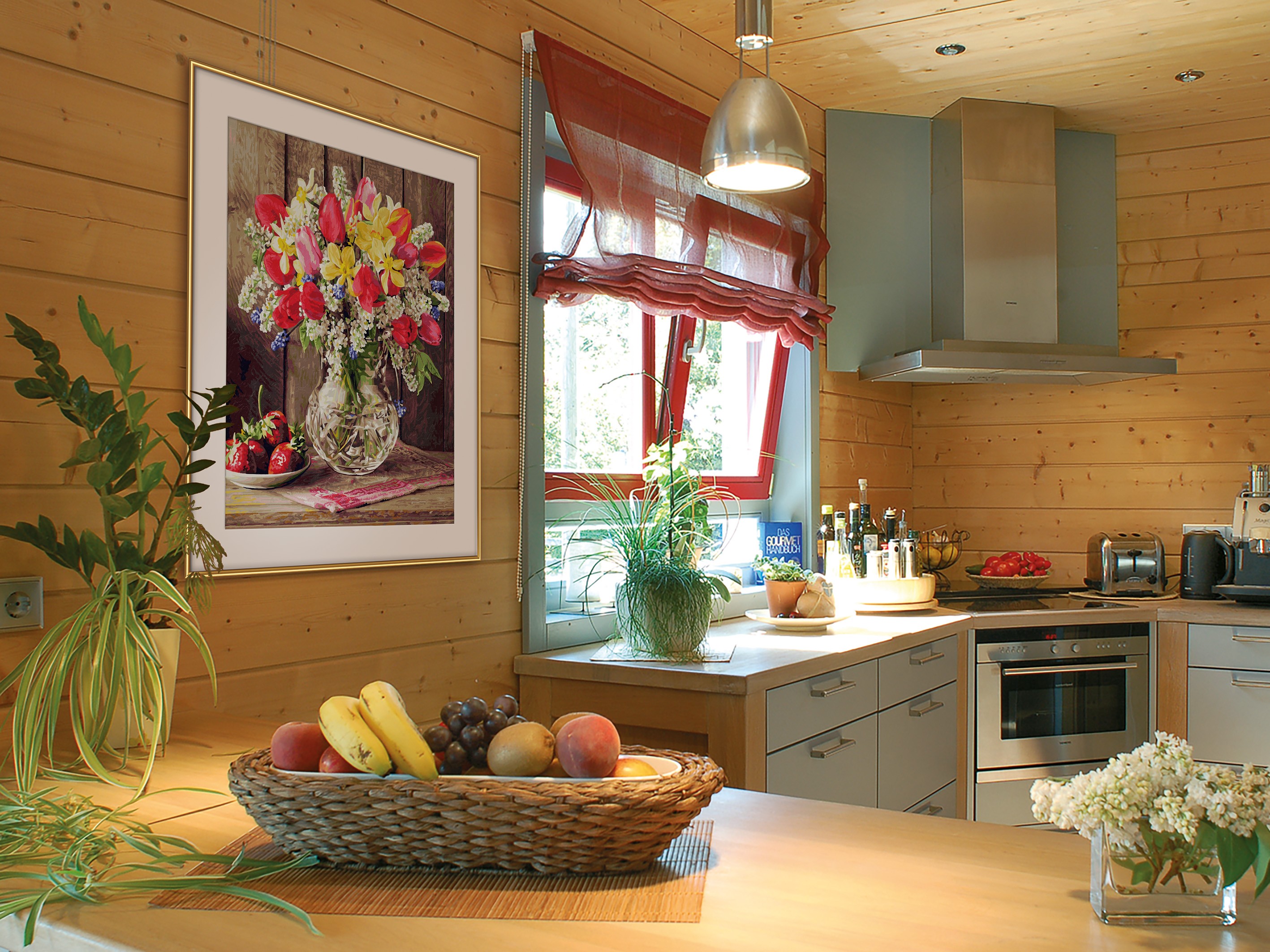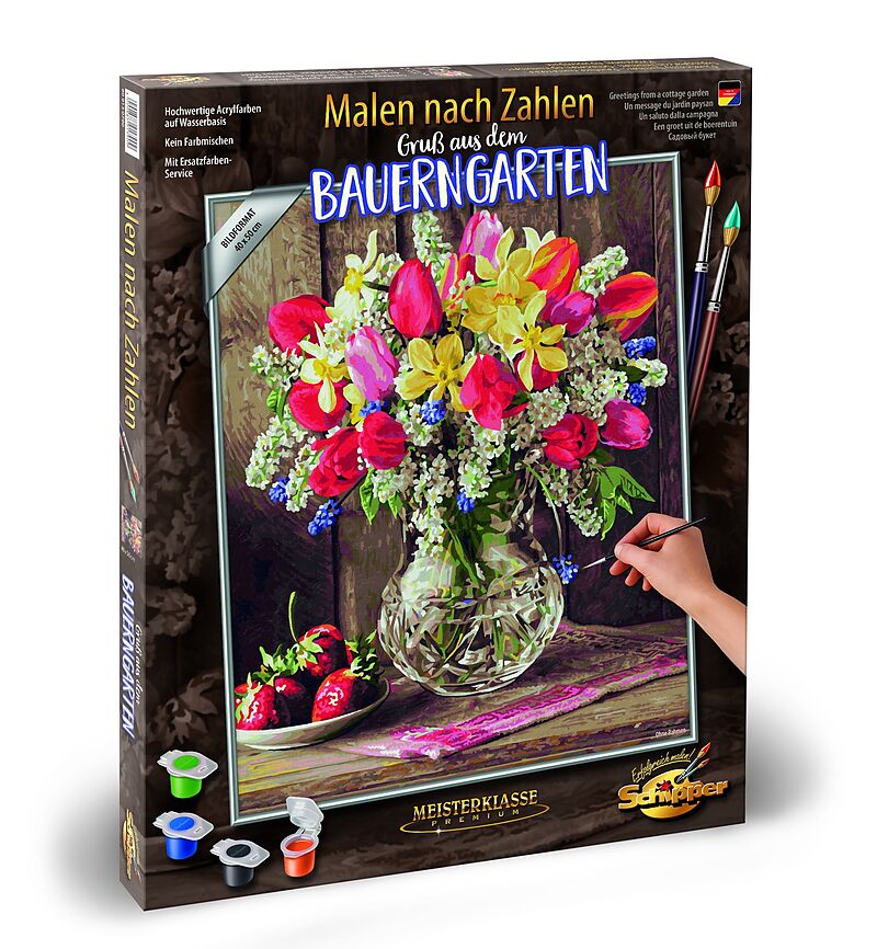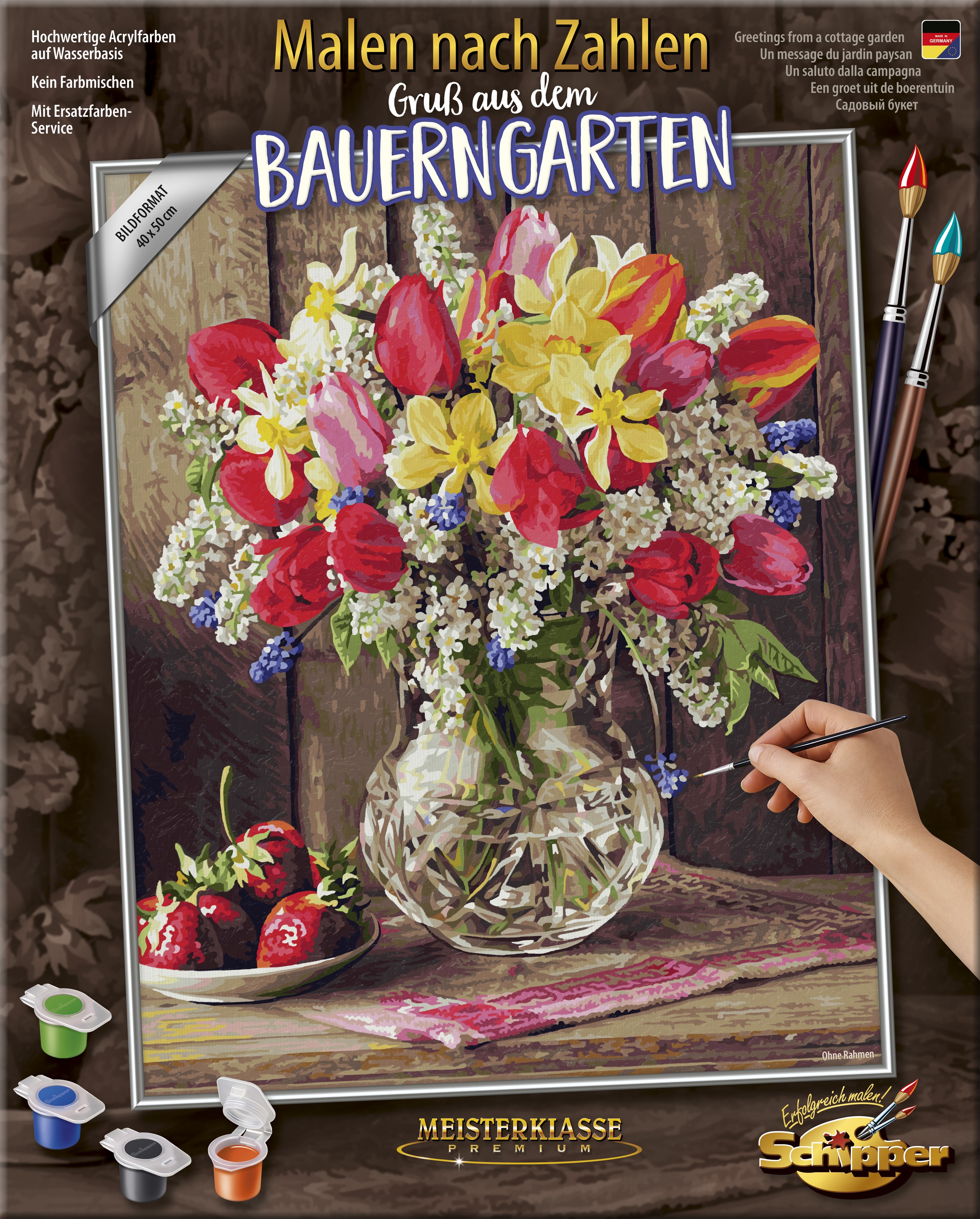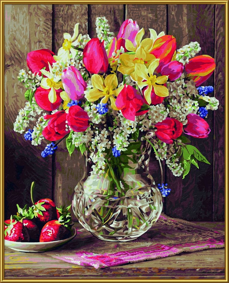 Der kunstvoll arrangierte Blumenstrauß in einer Kristallvase erzählt von den Wundern der Natur, die im Frühjahr den grauen Winter vergessen lassen und die Natur zu neuem Leben erwecken. Der bunte Strauß, umrahmt mit weißem Flieder und die köstlichen Früherdbee...