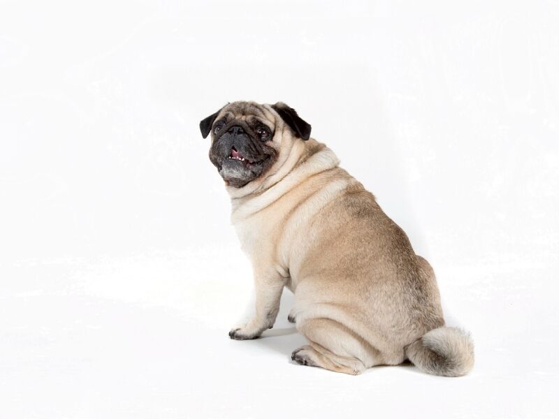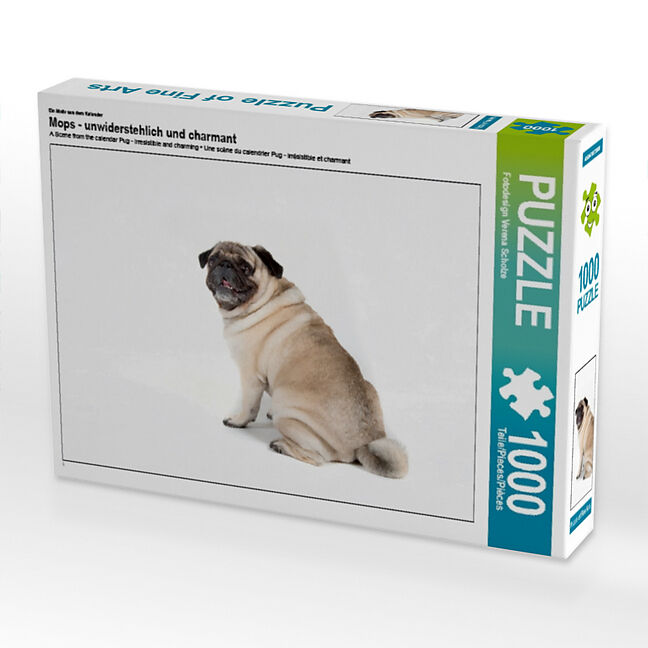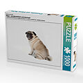 Der Mops vor einem einfachen weißen Hintergrund, ohne schmückendes Beiwerk, einfach nur schön in seinen verschiedenen Posen anzusehen. So offenbart sich der witzige und einzigartige Charakter dieses Exemplars seiner Rasse, der sich völlig entspannt und unbeoba...