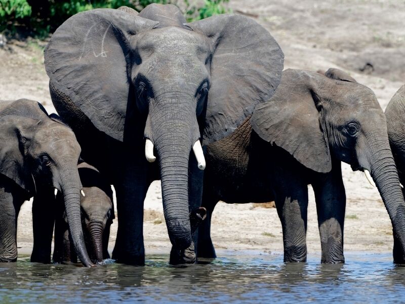 Kleine und große afrikanische Elefanten beim Wandern, Äsen, Trinken und Baden. Faszinierende Aufnahmen vom Elefantenfluß Chobe in Botswana, dem Hwange Nationalpark und Mana Pools in Simbabwe.