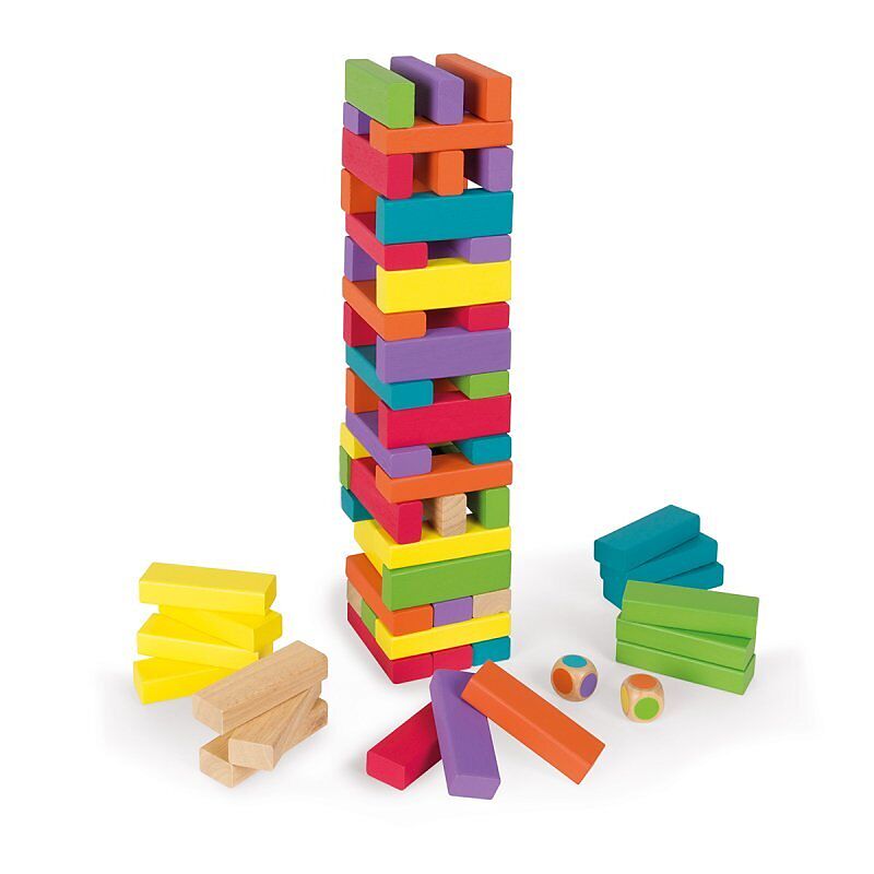 Equilibloc bunt, Holzspielzeug für Kinder von 3 bis 10 Jahre. Ziel des Spiels ist es, der Letzte zu sein, der einen Holzbaustein bewegt, ohne dass der Turm einstürzt.