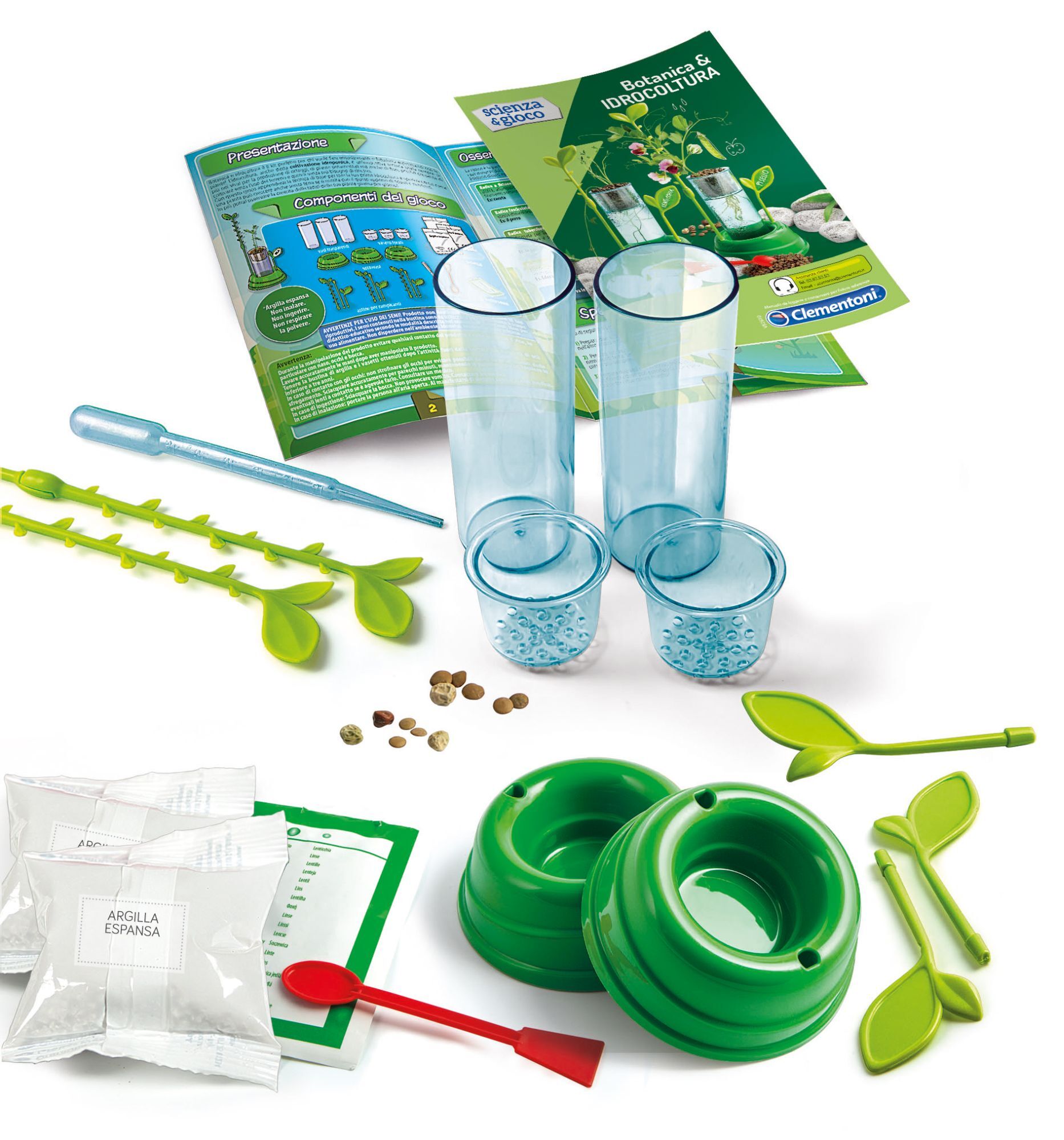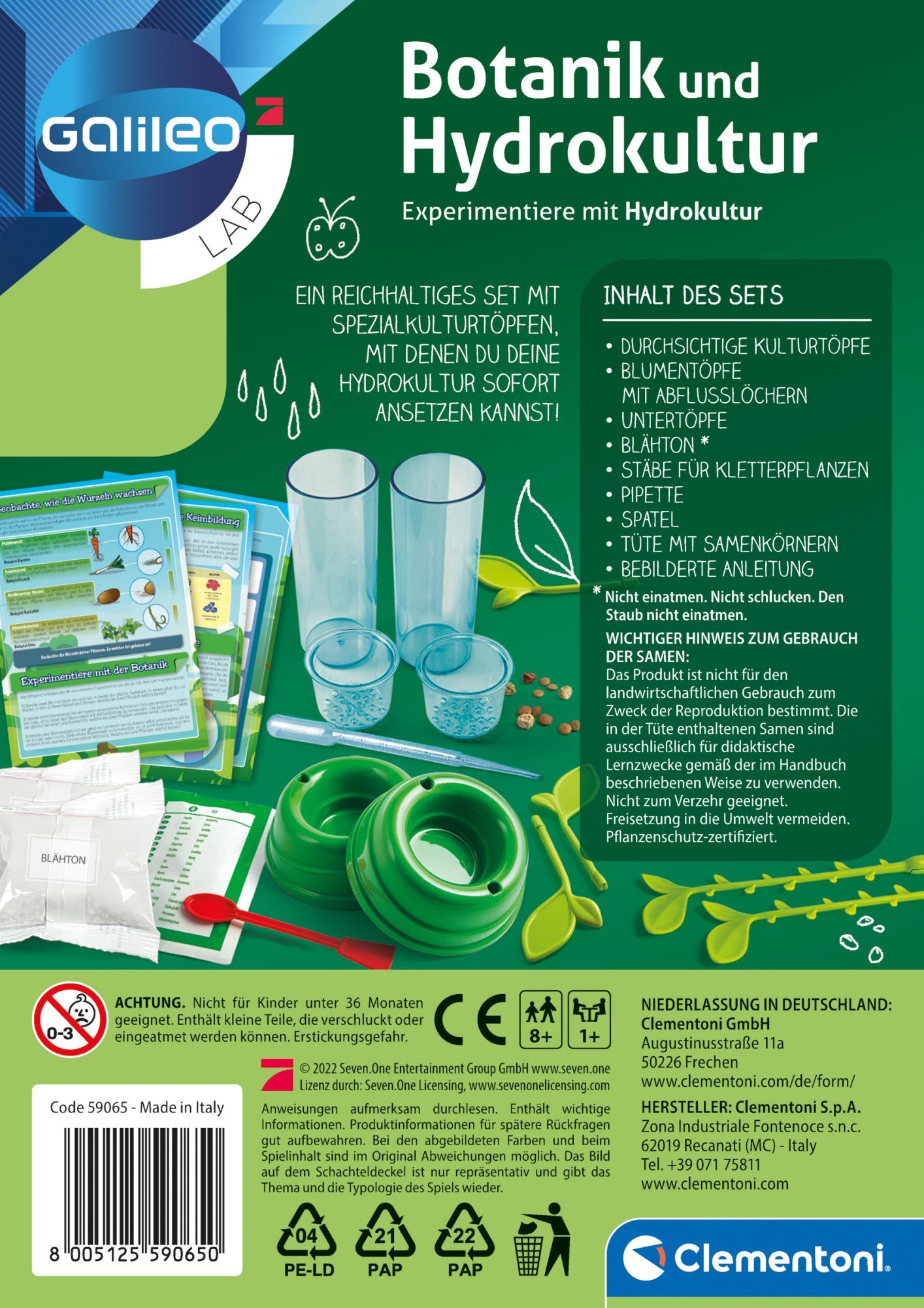 Clementoni Galileo- Botanik und Hydrokultur Ein innovatives Set zum Experimentieren mit Techniken der Hydrokultur! Mit diesen besonderen Pflanzgefäßen können Kinder Pflanzen ohne Boden anbauen! Das Set enthält auch Pflanzenwurzelmaterial, Saatgut und pulverisi...